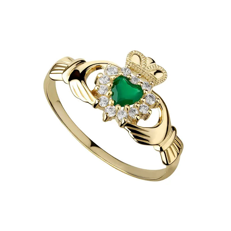 Allow the luxury of our exquisite Claddagh ring to create unforgettable moments of joy and connection. Expertly crafted from fine 10k Karat gold, this stunning piece is the epitome of elegance and durability. The lovely, green agate stone at the center of the Claddagh design is surrounded by shimmering cubic zirconia gemstones for added glam. A symbol of love, loyalty, and friendship, this ring carries profound meaning, representing everlasting connections. It serves as a remarkable gift, perfect for expressing your affection. With timeless beauty and exceptional craftsmanship, a Claddagh ring often becomes a cherished generational heirloom, connecting loved ones for years to come.Â