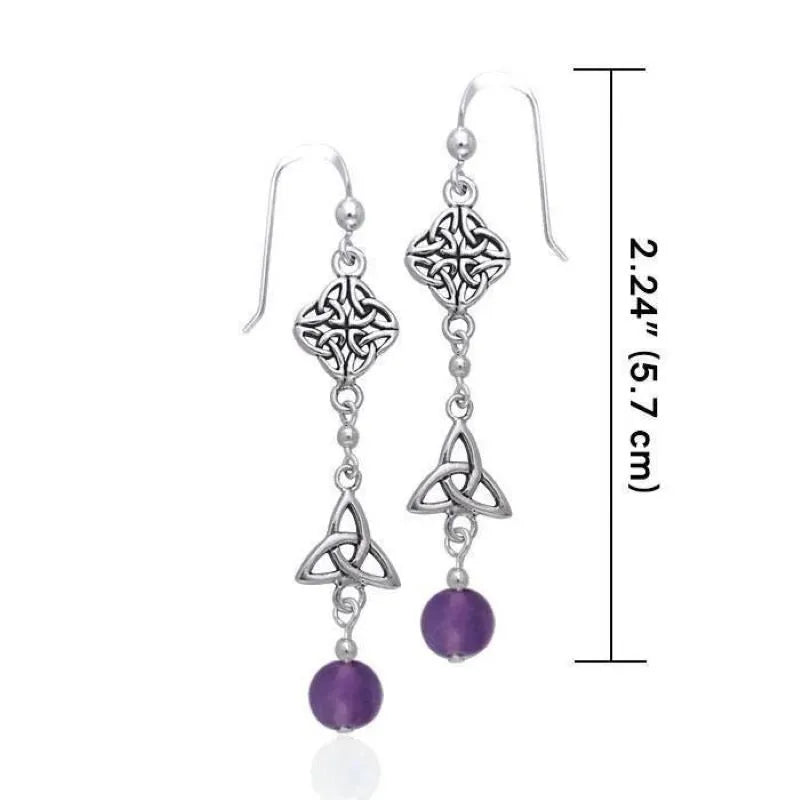 Style your next outfit with our Amethyst Celtic Triskele Dangle Earrings and you're sure to make an impression! These stunning Celtic earrings combine meaningful symbolism with elegant design, featuring intricate Trinity knots that adorn each piece. The Trinity, an ancient Celtic symbol, represents the interconnectedness of all things in life and the Father, Son, and Holy Spirit in Irish Christianity. At the bottom of each earring, a deep purple amethyst gemstone adds a touch of luxury and spiritual significance. Amethyst is known for its calming properties, believed to bring peace, balance, and protection to the wearer, making these earrings a fashion statement, plus a source of positive energy. Crafted from rust-resistant sterling silver, these dangle-style earrings measure 0.41" in width and 2.24" in length, providing the perfect balance of durability and subtlety. They come beautifully packaged in a gift box, making them an ideal present for someone special as well. Whether you're drawn to Celtic heritage, the healing properties of amethyst, or simply the exquisite design, this pair of Irish earrings is a must-have!