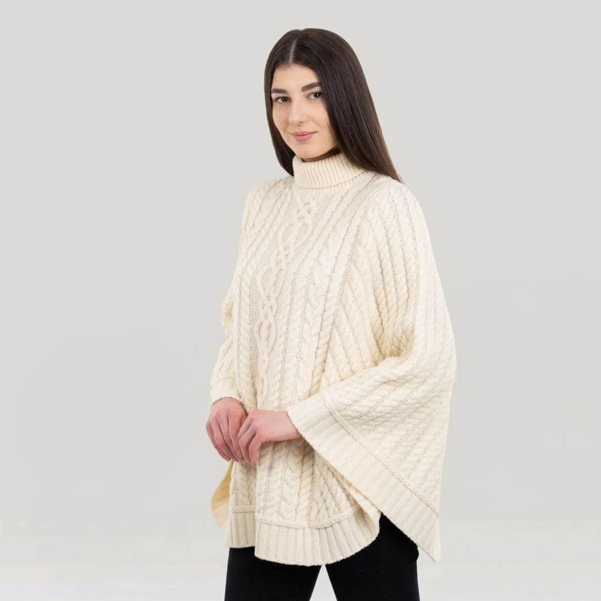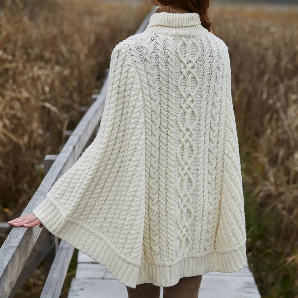 Add a sparkle of Irish charm to your wardrobe with our gorgeous Irish Country Knit Poncho. From its humble origins as traditional fisherman's attire to its current iconic status as a timeless fashion classic, Aran knitwear has always been praised for its unique style, imbued with deep meaning. Knit with a variety of Irish cable stitches, this Aran poncho celebrates the age-old traditions of the Aran islands in a modern piece. The cable stitch is designed to resemble the sturdy ropes used by the brave Irish fishermen when sailing in the cold water of the Atlantic and symbolize strength and a wish for safety. Besides their beautiful association with the adventurous life of the islanders, these stitches were also made as a double layer of insulation and breathability so that the fishermen would stay protected from the elements no matter the weather. The poncho is skillfully made of 100% Merino wool, an ethically sourced natural material, guaranteeing durability, warmth, and increased softness. It's also breathable and resistant to moisture, so it will keep you dry whether it's a hotter day or a humid, rainy one. The roll neck can be adjusted according to your needs for even more coziness. The best part comes here - it's machine washable, thanks to SAOL's innovative anti-shrink technology. Goodbye, complex wool washing instructions!