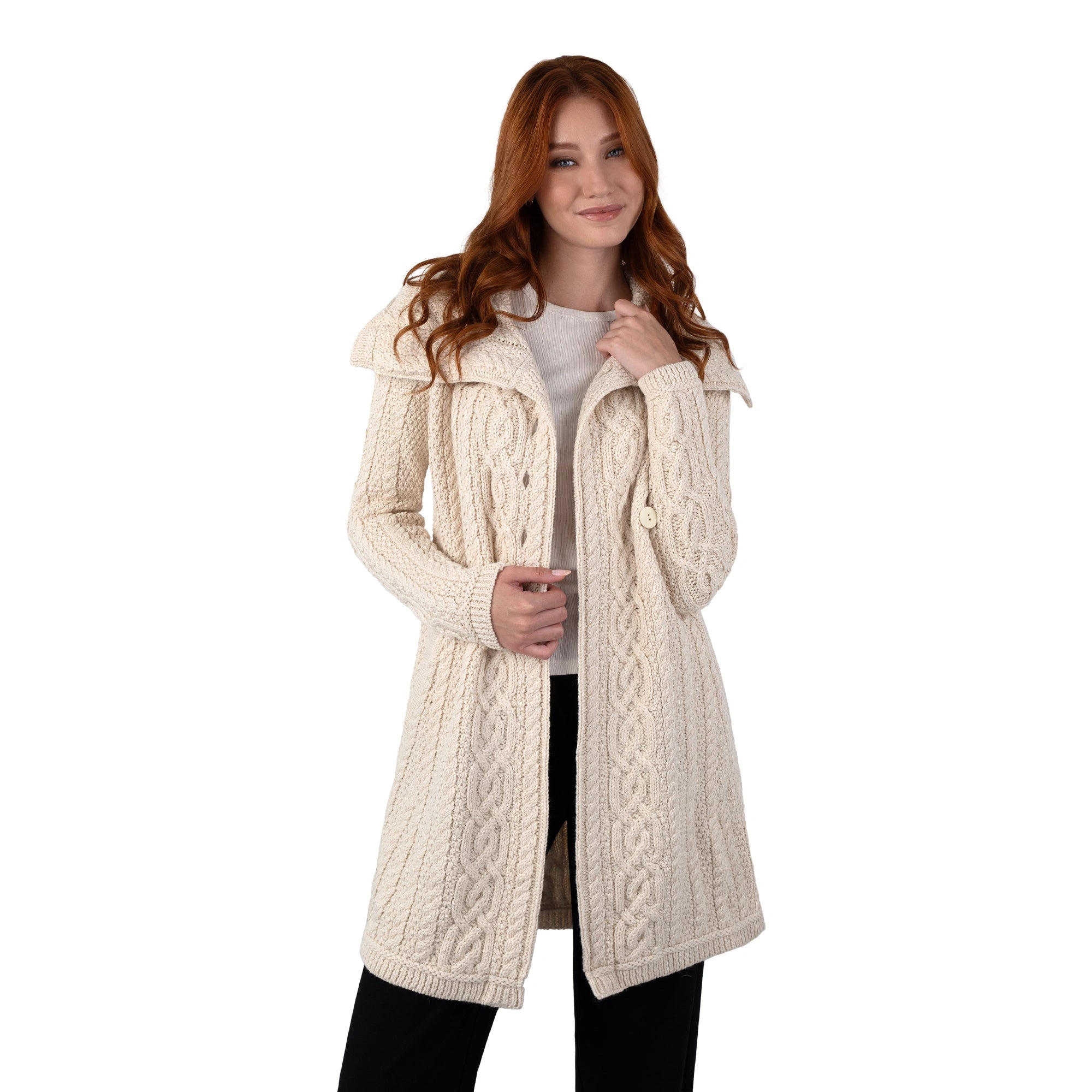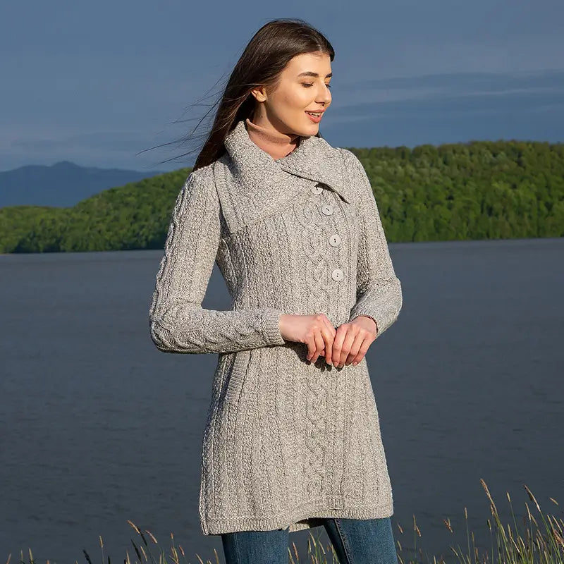 Cozy up in Irish tradition with our Asymmetrical Irish Sweater Coat. Featuring the timeless cable and moss stitches, this sweater coat carries deep-rooted Irish symbolism. The cable stitch resembles fishermen's ropes and is a blessing of good luck and safety, while the moss stitch is inspired by the lush Irish landscape and is a symbol of abundance. Crafted in Ireland from a luxurious Merino wool blend, this coat provides warmth and breathability, making it ideal for year-round wear. The heat-insulating and moisture-wicking properties of Merino wool keep you cozy in colder months while remaining lightweight and comfortable when temperatures rise. Plus, this sustainable blend ensures lasting softness and durability. Best of all, SAOL's machine-washable formula ensures effortless care, so you can enjoy this beautifully crafted sweater coat. The sweater coat features an eye-catching chunky collar that adds a touch of sophistication while keeping you extra warm. The four-button asymmetrical closure gives it a modern, tailored look, allowing for easy layering over any outfit. A side pocket adds functionality, perfect for keeping hands warm or holding small essentials.