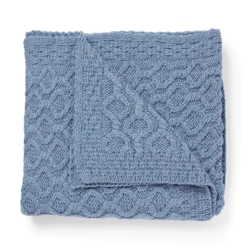 Wrap yourself in warmth and coziness with our Aran Supersoft Merino Throw which celebrates Irish history, craftsmanship, and tradition. The throw is made of 100% supersoft Merino Wool, a sustainable material that helps regulate the body's temperature. Merino Wool has great breathability and moisture-wicking properties making it suitable for outside use as well. The authentic design is inspired by Irish fishermen's sweaters and features cable and basket Aran stitches. The basket stitch depicts the fish-holding baskets that fisherman use on their boats, signifying their desire to catch more seafood and succeed at sea. The cable stitch resembles the Irish fishermen's ropes, a symbol of good luck and an abundant catch. Measuring a generous 60" by 36", this versatile throw can be used as a stylish piece of decor, a warm blanket for those cozy nights on the couch, or a picnic blanket to bask in the sun. This Irish Aran throw would make a thoughtful gift for someone special in your life or a wonderful way to treat yourself.
