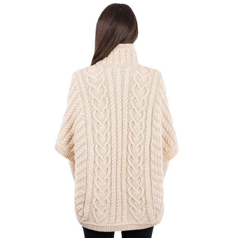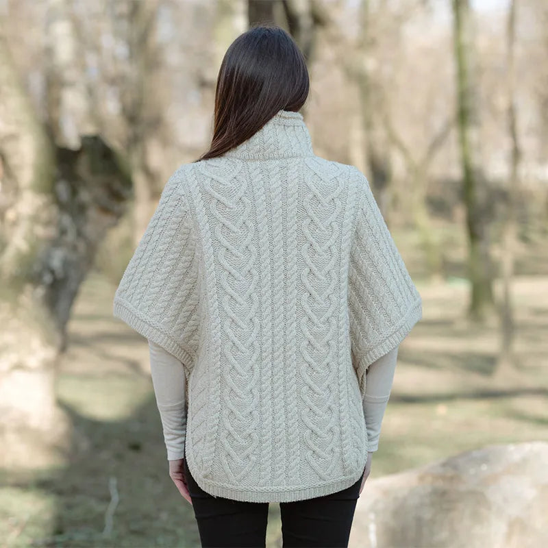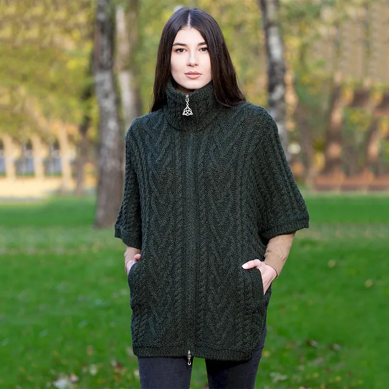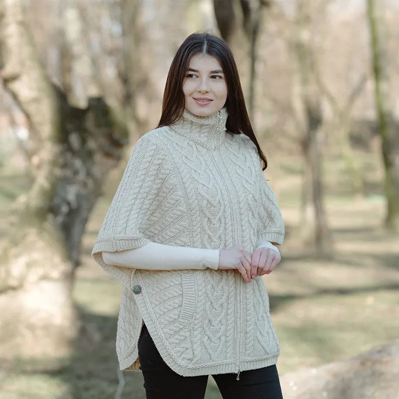 Enhance your looks with a dash of cultural essence with our Funnel Neck Poncho Jacket. This poncho is crafted of 100% Merino wool, a material known for its softness, heat-insulating properties, and comfort. The Aran Stitching design adds a touch of authenticity, making it visually appealing and meaningful. According to legend, cable knitting symbolizes the ropes used by Aran fishermen and a wish for a successful catch. The poncho has a full front zipper which allows easy opening or closing of the garment. The zipper is adorned with a Trinity Knot, an Irish symbol that represents unity and eternity. The high funnel neck collar provides extra coverage and warmth to the neck area. Our Irish poncho is a combination of modern comfort and traditional design, ideal for everyday wear.