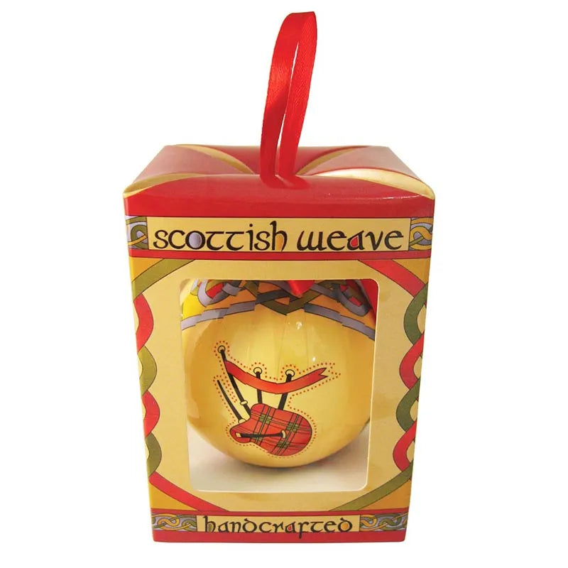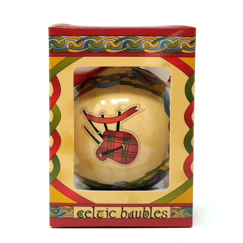This Handmade Bag Pipe Scotland Christmas Bauble will help you create the Christmas tree of your dreams - all with sparkles of cultural identity! Our baubles are feature Scottish bagpipes in exquisite detail. We bet everyone heard about the legendary tales and battles that made the Scots worldwide known as one of the brave people, but did you know that these important events were accompanied by bagpipe music? Bagpipes were commonly used as rallying instruments during wars. Later on, the sound of the bagpipes became tunes for battle, marches, gatherings of friends and family, martial salutes, and laments. Why not have a piece of that history straight to your home? This Scotland Christmas bauble is a tribute to the outstanding bagpipes that hold a special place in the hearts and minds of the Scottish people. The bauble's charm doesn't end here! It's handmade of papier mache, using techniques inspired by the ancient Victorian art of decoupage; so, you're not only getting a resistant piece to hang on your tree year after year but also a unique decor (no two pieces are identical!). Coming with a charming gift box, you can even offer it to someone special to remind them of their Scottish roots - it will make an unforgettable Christmas gift.