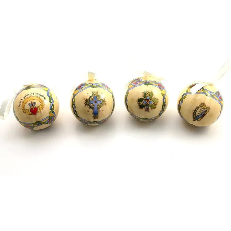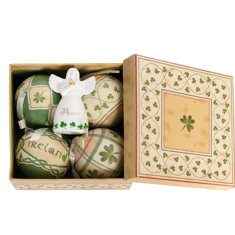 Bring a little Irish cheer to your holiday decor with our Hand-Painted Celtic Christmas Baubles & Angel Set! The bundle includes 4 unique, papier mache Christmas baubles, designed in an authentic Celtic style through the Victorian art of decoupage, and a hand-painted Irish angel figurine made of premium porcelain, adorned with bright shamrocks & 'Peace' message. Perfect for adorning your Christmas tree, the round baubles are sized 2.95'' in diameter, finished with sleek ribbons. The angel, whether it will be the centerpiece of the Christmas table, an inspiring reminder of the season's gentle magic, or a symbol of peace watching over your home, brings a sense of comfort and hope to every corner it touches. The bundle makes a special addition to your home, one that's sure to grow into a beloved family heirloom, and a great gift for Secret Santa, Christmas, and many more!