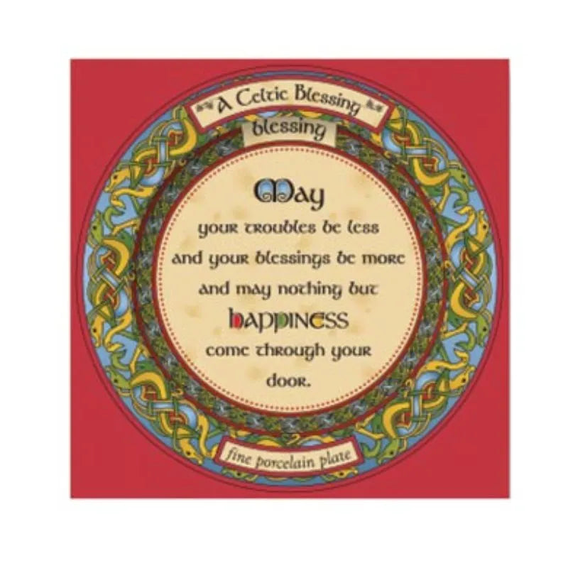 Our Ceramic Celtic Blessing Irish Plate brings a heartfelt wish for happiness, love, and prosperity to anyone's home! Featuring an intricate Irish weave design, with colorful knots & swirls inspired by the illustrations found in the ancient Book of Kells, this plate carries deep cultural meaning. This knotwork symbolizes eternity and connection, while the beautifully inscribed Irish home blessings offer warm wishes of happiness, love, laughter, friendship, and peace: 'May love and laughter light your days, and warm your heart and home. May good and faithful friends be yours, wherever you may roam. May peace and plenty bless your world with joy that long endures. And may all life's passing seasons bring the best to you and yours' & ''May your troubles be less and your blessings be more and may nothing but happiness come through your door' - a timeless sentiment that makes any house feel like home. Check out our Kitchen and Glassware collection for matching Celtic-inspired kitchenware, mugs, and home decor. Crafted from 100% high-quality bone china, this plate is durable, chip-resistant, and designed to last. Its elegant shine and vibrant colors won't fade over time, making it a lasting keepsake. The plate is also dishwasher and microwave-safe. Measuring 4 inches in diameter, it's the perfect size to display on a wall, shelf, or tabletop. Plus, it comes ready for gifting in a beautiful box with an easel and hook - so whether you prefer to hang it or display it standing, it fits effortlessly into any space. Whether for yourself or a loved one, this plate is a meaningful Irish gift that brings tradition and blessings into any home.
