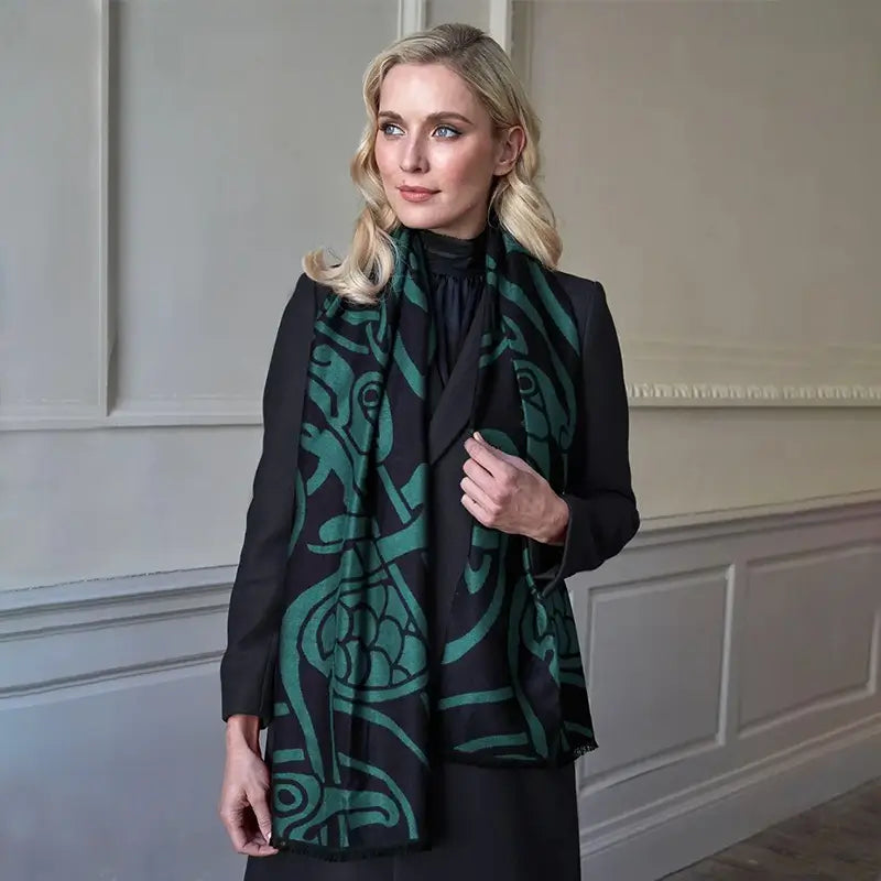 Stay stylish and embrace the rich cultural heritage of Ireland with our Reversible Scarf. Inspired by the captivating motifs and vivid illustrations from the iconic Book of Kells, this scarf features a reversible design with Celtic style patterns in an elegant color scheme. The Celtic patterns with intricate knots and spirals symbolize eternity, interconnectedness, and the cycle of life, reflecting deep cultural heritage. Crafted from lightweight viscose, this scarf combines softness with warmth, providing comfort and a touch of sophistication to any outfit. The viscose material feels silky-smooth on the skin, ensuring you stay cozy. Measuring 68.9"" in length and 16.5"" in width, this scarf can be styled in multiple ways--whether draped over your shoulders, wrapped around your neck, or folded for a more refined look. Its versatility ensures you can create different styles to suit your mood or the season. This reversible Gaelic scarf is a beautiful accessory and also a meaningful gift, perfect for anyone with an appreciation for Celtic art, history, and symbolism. For a complete Irish-inspired look, pair it with a cozy Irish cardigan or an Irish wool bag to elevate your style. For a special occasion or simply just a thoughtful gesture, this gorgeous scarf is sure to impress.