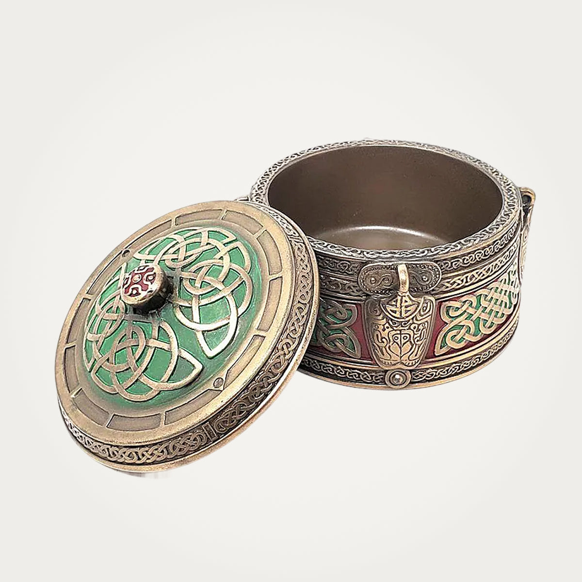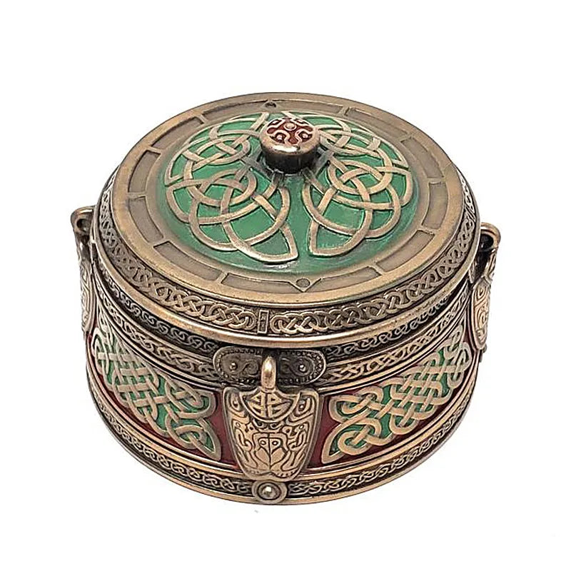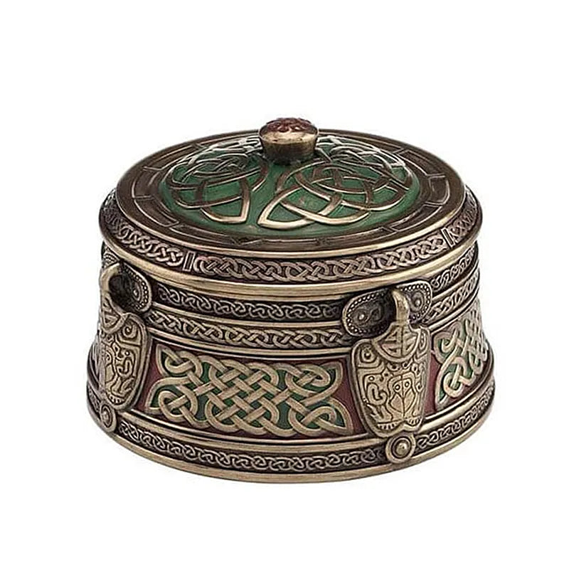 This Bronze Celtic Trinket Box will give your life a vintage vibe. This piece is made of cold cast bronze that is sturdy and highly resistant, promising long-lasting use. Our round trinket box is the ideal storage for jewelry and will keep your items organized and protected. It is finely adorned with various Celtic symbols that add a sense of cultural significance. The never-ending knotwork represents the ideas of eternal change and transformation. Dust this bronze piece regularly, at least once a week, or when needed. Add some Celtic essence to your daily life with this home decoration.
