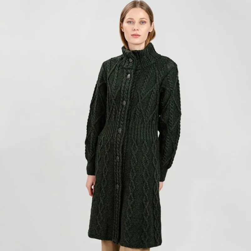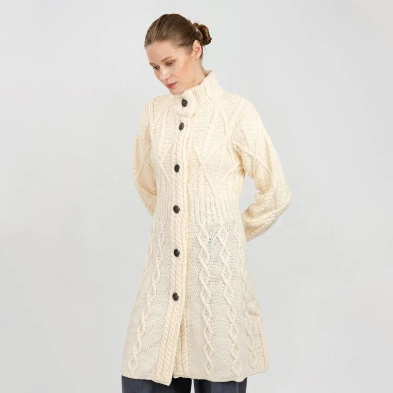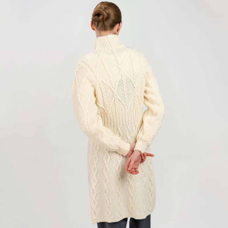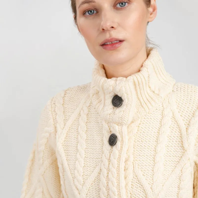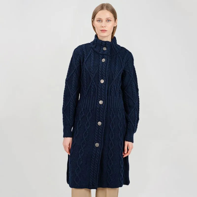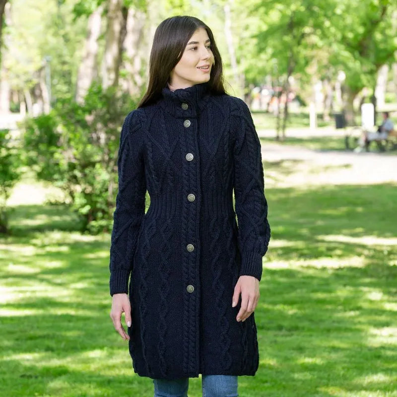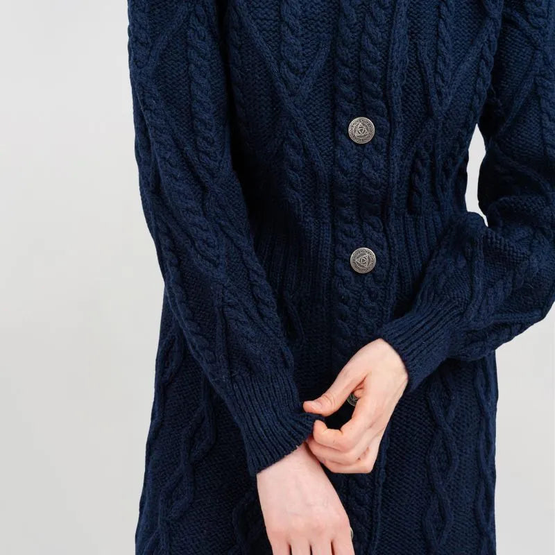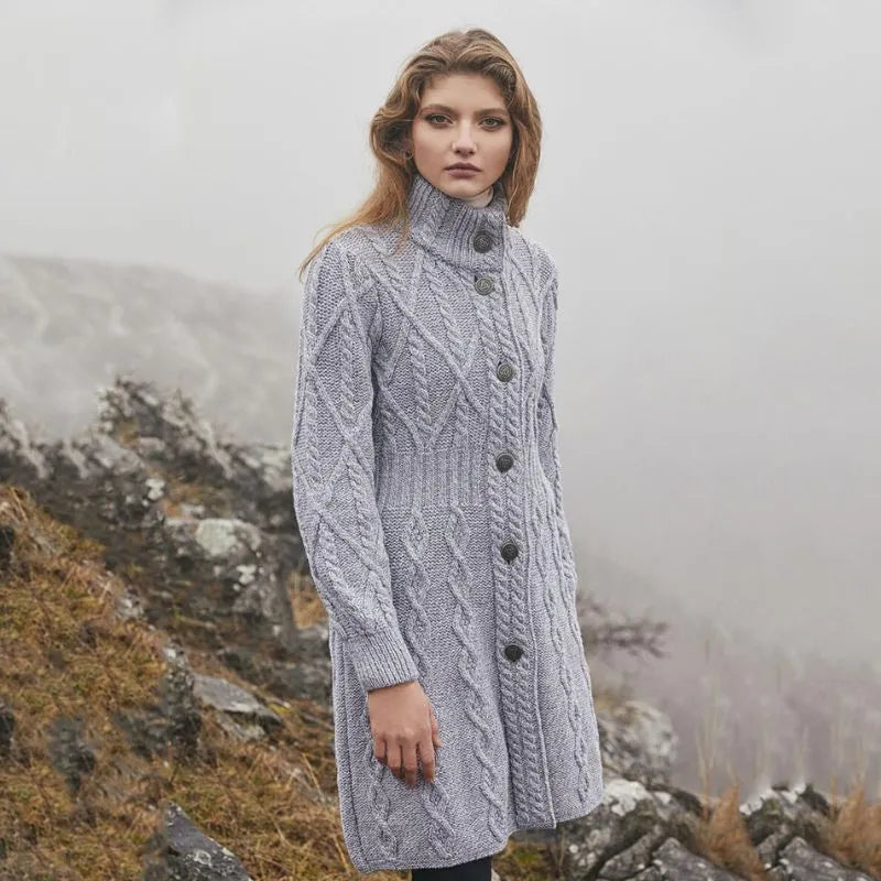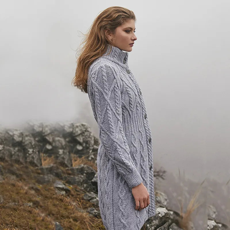 If you love garments that are both stylish and packed with heritage, our Cable Merino Aran Jacket is for you. Inspired by the traditional Aran fisherman sweaters, this jacket carries the legacy of Irish craftsmanship into a versatile, modern design. Its intricate cable stitches are more than just beautiful - they tell a story about the people that live on the Aran islands. Resembling the fishermen's ropes, they were thought to bring blessings of good luck and safety. Mothers and wives carefully wove these patterns as heartfelt wishes for protection during treacherous sea voyages. The Aran stitches aren't just symbolic, but they're practical, too. Originally crafted to withstand the harsh Atlantic weather, they enhance breathability and heat insulation. This jacket is crafted using the same old-age techniques, offering comfort and warmth on the chilliest of days. This coat is made from 100% Merino wool, an ethically sourced and luxuriously soft yarn. This organic wool is super heat-insulating, moisture-wicking, and impressively durable. Plus, it's treated with SAOL's anti-shrink technology, so you can toss it in the washing machine without a second thought, as it'll keep its shape and color wash after wash. This long Aran coat, falling just above the knees, features a raised turtleneck collar and a full buttoned front - and because we like attention to detail, even the buttons feature Celtic knots on them. Ribbed waist, cuffs and neckline provide a snug, warmth-trapping fit. Perfect for transitional seasons, it's endlessly versatile - layer it up and use it as a jacket when you go to office or just having a stroll around the city. Made in Ireland, this jacket is a timeless blend of tradition and everyday practicality - and it makes a wonderful gift too!