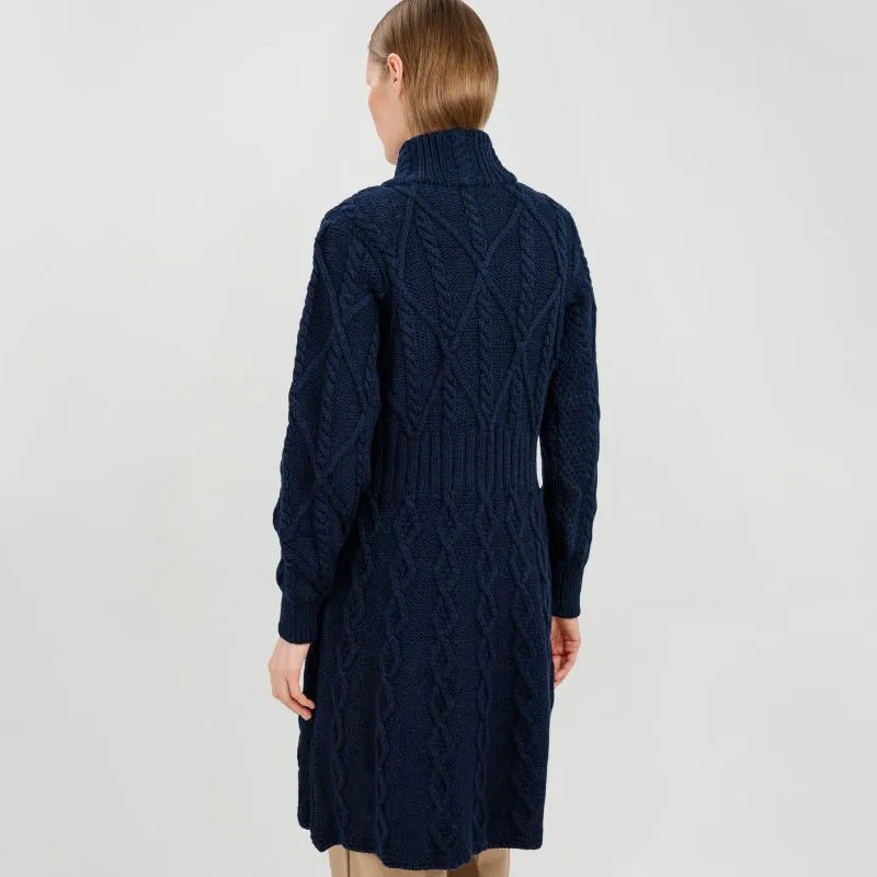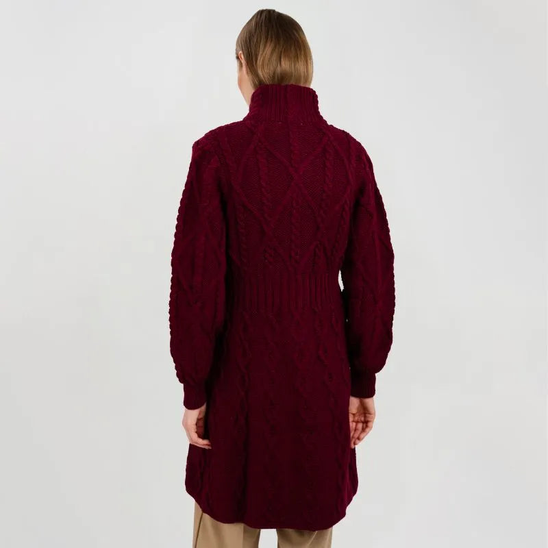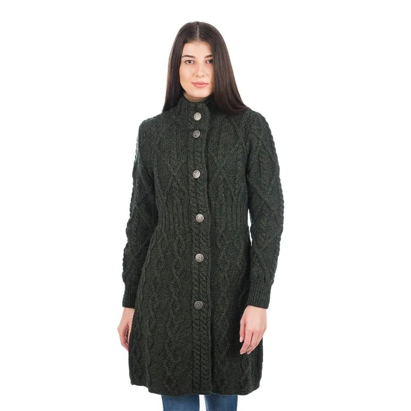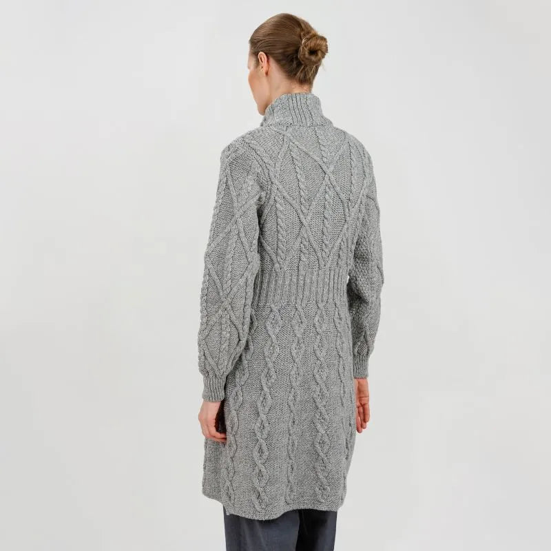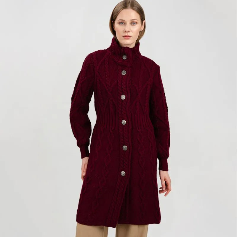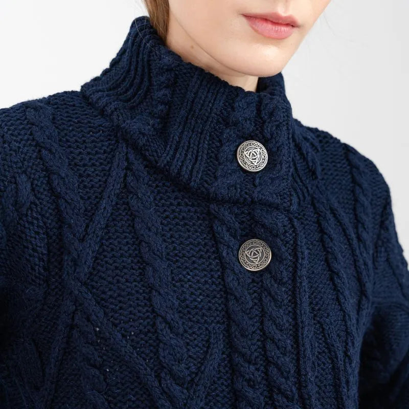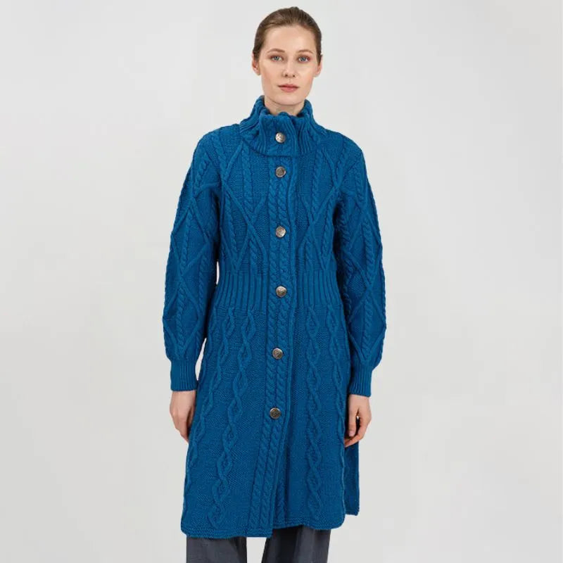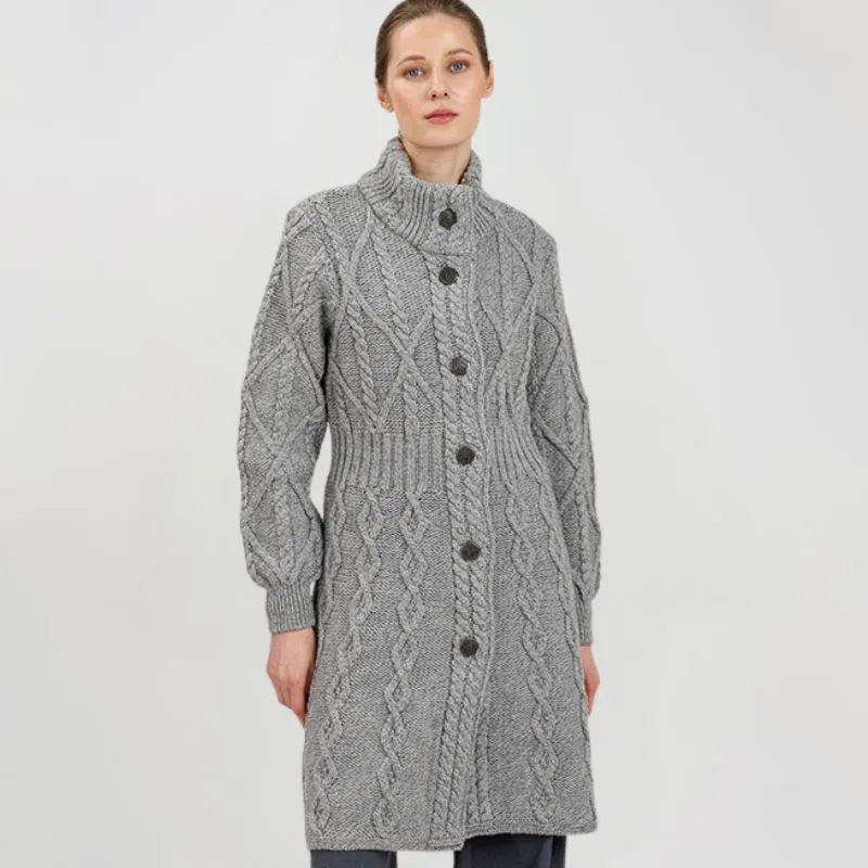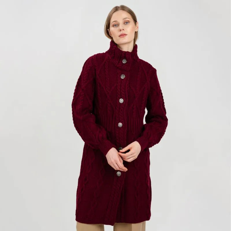 If you love garments that are both stylish and packed with heritage, our Cable Merino Aran Jacket is for you. Inspired by the traditional Aran fisherman sweaters, this jacket carries the legacy of Irish craftsmanship into a versatile, modern design. Its intricate cable stitches are more than just beautiful - they tell a story about the people that live on the Aran islands. Resembling the fishermen's ropes, they were thought to bring blessings of good luck and safety. Mothers and wives carefully wove these patterns as heartfelt wishes for protection during treacherous sea voyages. The Aran stitches aren't just symbolic, but they're practical, too. Originally crafted to withstand the harsh Atlantic weather, they enhance breathability and heat insulation. This jacket is crafted using the same old-age techniques, offering comfort and warmth on the chilliest of days. This coat is made from 100% Merino wool, an ethically sourced and luxuriously soft yarn. This organic wool is super heat-insulating, moisture-wicking, and impressively durable. Plus, it's treated with SAOL's anti-shrink technology, so you can toss it in the washing machine without a second thought, as it'll keep its shape and color wash after wash. This long Aran coat, falling just above the knees, features a raised turtleneck collar and a full buttoned front - and because we like attention to detail, even the buttons feature Celtic knots on them. Ribbed waist, cuffs and neckline provide a snug, warmth-trapping fit. Perfect for transitional seasons, it's endlessly versatile - layer it up and use it as a jacket when you go to office or just having a stroll around the city. Made in Ireland, this jacket is a timeless blend of tradition and everyday practicality - and it makes a wonderful gift too!