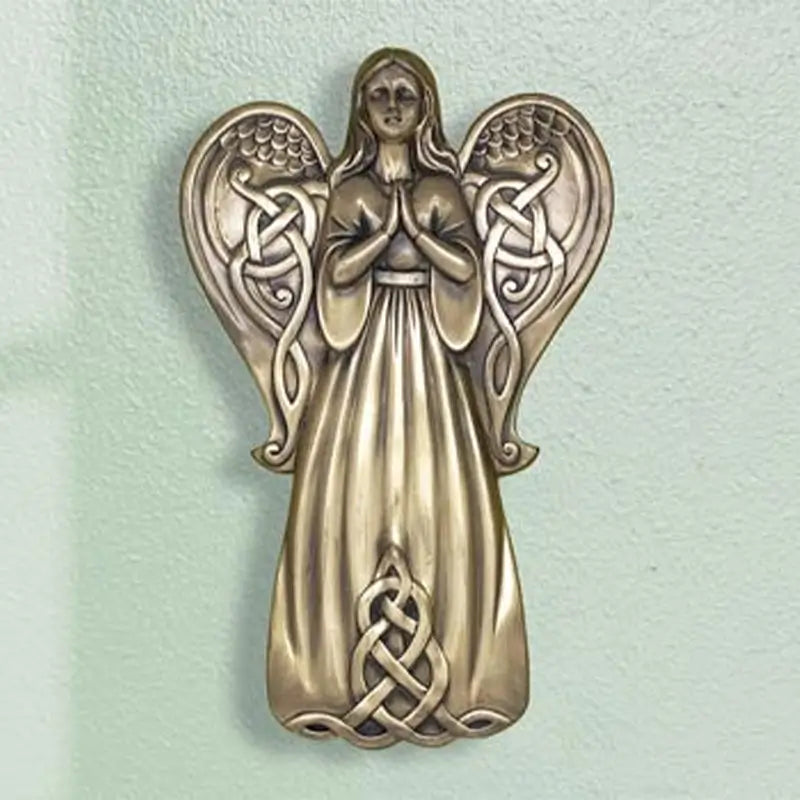 Our best-selling Celtic Angel Wall Plaque is an ageless talisman of luck, divine protection, and love. Shaped like a caring, praying guardian angel, with finely crafted wings in a delicate embrace and interlaced carved knots, this Celtic plaque is ready to brighten up your home. The design honors the rich Celtic art traditions, providing the plaque a deeper cultural dimension. Skillfully plated with polished cold-cast bronze, this Irish plaque is durable and lustrous, ensuring it's resistant to rust. The use of antique bronze adds a touch of vintage charm, enhancing the overall look of the wall plaque. Standing at approximately 8.27 inches x 5.12 inches, this Celtic plaque can be perfectly hung on any wall- it has a hole at the top for easy display. Our angel wall plaque is a timeless embodiment of ancient Celtic tradition and a cherished symbol of enduring love and positive energy. Explore our selection of Celtic Wall Art for more exclusive, original artworks. It comes in a themed box and is ready to be offered as a gift on any occasion where a little blessing may be need, such as engagement parties and housewarmings.