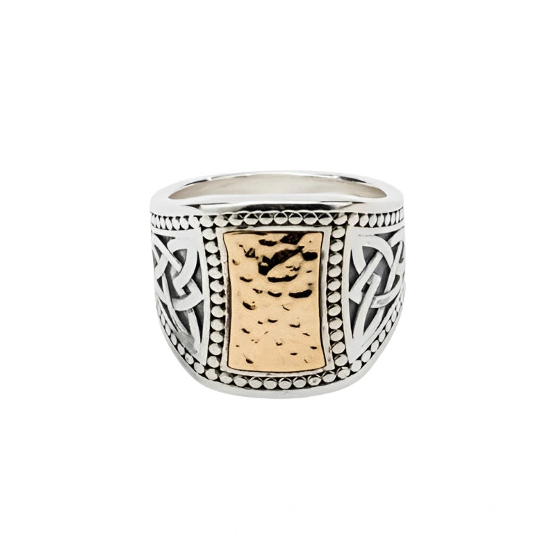 Our Hammered Gold Inset Ring, Wide is an Irish masterpiece that's sure to become your new favorite accessory. It's crafted of sterling silver, a rust and tarnish-resistant material that guarantees this piece becomes a heirloom to be passed down through generations. The hammered gold inset and the resplendent 10k gold ingot complete this ring, and make it a truly luxurious accessory. Finely crafted Celtic Eternal knots on its sides speak about interconnectedness, infinity & the eternity of life. With a width of 0.78 inches at its widest point, this ring transforms into a bold Irish statement piece, capturing attention with exquisite craftsmanship and cultural design.