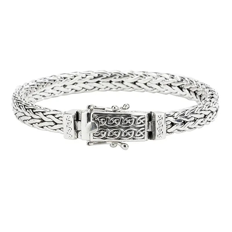Embrace the rich legacy of Irish culture with this exquisite Flat-weave Heritage Bracelet. Handcrafted from sturdy sterling silver, this captivating piece exudes elegance and timeless style. The bracelet's intricate flat-weave design showcases the beauty of Celtic Knotwork, a symbol deeply rooted in Irish heritage. Each intricate pattern, with its twists and turns, tells a story, connecting you to the enduring traditions of generations past. The weighty links, reminiscent of ancient Celtic craftsmanship, embody strength and resilience, reminding you of the unwavering connection to your roots. The practical box clasp adorns an endless knot, representing the interconnectedness of all things and the enduring nature of time. Our celtic bracelets made in Ireland complement various styling choices and occasions, making them a cherished gifts for anyone embracing their Irish heritage.
