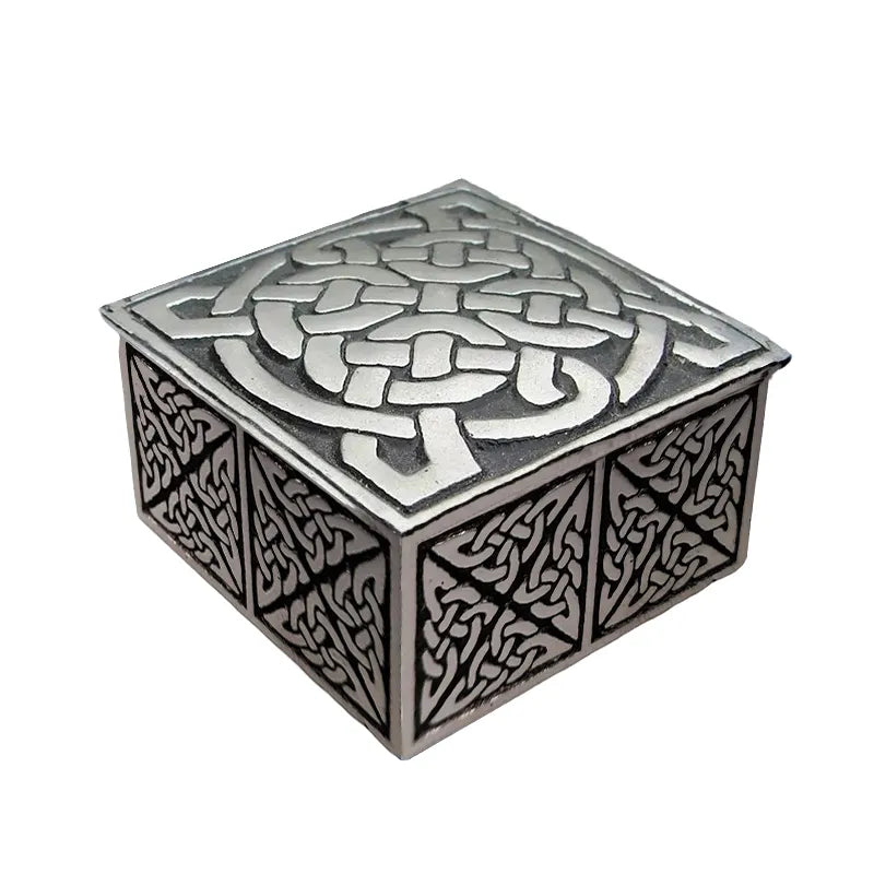 Keep your most precious small trinkets in our square Celtic box. The box is made by hand by skillful artisans from pewter. This metal is incredibly malleable, so it can be easily shaped into various intricate designs. This box features a beautiful Celtic Knot design. This symbol embodies timeless concepts such as eternity, unbreakable bonds, and the interconnectedness of all things. It's a beautiful cultural emblem that has been around for centuries. The intricate and deeply meaningful design makes this small box the perfect item for storing your most prized jewelry and other precious ornaments.
