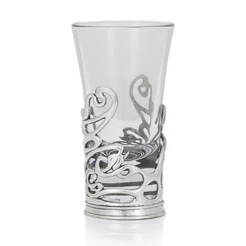Elevate your drinking experience with this exquisite Celtic Swirl Shot Glass Holder! This glass shot is accompanied by an elegantly designed holder crafted from 100% pewter. The combination of these high-quality materials ensures a sophisticated and durable product that exudes elegance. With dimensions of 1.57" x 2.36", this shot glass is perfectly sized to hold a single shot of your favorite spirit. Its compact and sleek design adds a touch of sophistication to your drinking experience. The captivating design of the holder features a never-ending swirl, creating a mesmerizing visual effect that will captivate your guests and adorn your dinner parties. It is the perfect gift for yourself or a dear one!