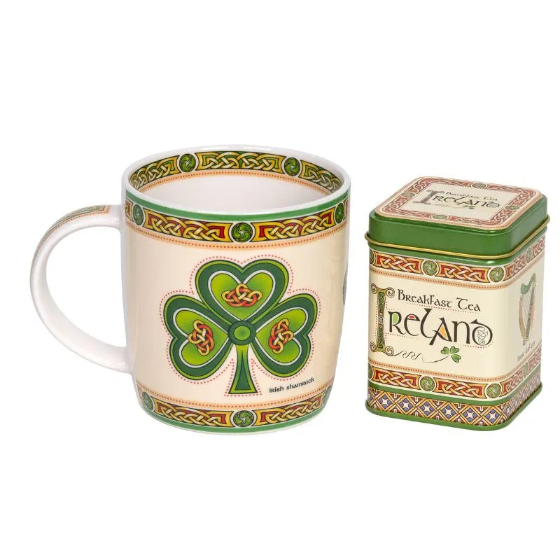 Our Book of Kells Designed Shamrock Mug Collection will carry you to the heart of Ireland. Each mug tells a story of its own. The design draws inspiration from the Book of Kells, Ireland's most treasured manuscript, a masterpiece of color, faith, and artistry. The intertwining Celtic knots and delicate shamrocks wrap gracefully around the mug, their patterns alive with history and meaning. Crafted from fine bone china, its dishwasher & microwave safe, strong enough for everyday use, and perfectly sized at 12.5 fl oz. The companion ceramic shamrock coaster completes the picture. Every detail is hand-finished with care, a soft glossy glaze catching the light, a natural cork backing to protect your table, and a design that mirrors the ancient Celtic belief in the connectedness of all things. And if you want to carry that feeling a little further, pair it with our Ceramic Shamrock Irish Cookie Jar. And then there's the tea, a 1.41 oz of loose-leaf Irish Breakfast blend. It's strong, full-bodied, and endlessly comforting. The sort of tea that makes mornings softer and afternoons a little kinder. Packaged in a reusable tin, simple, classic, and sturdy, it's the kind of piece you'll keep long after the last scoop of tea is gone, perhaps to store sugar, keepsakes, or just a little reminder of Ireland itself.