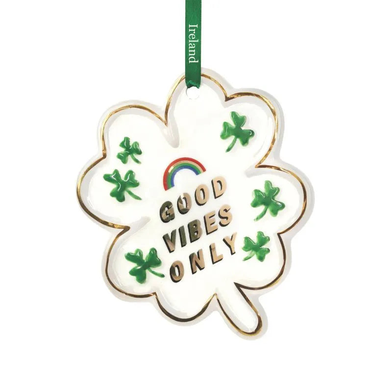 Our Irish Four Leaf Clover Ceramic Christmas Decoration adds a sprinkle of Irish luck to your tree, making it the perfect Celtic Christmas keepsake or gift for loved ones! This bone china hanging ornament is shaped like a lucky 4-leaf clover and features richly painted green shamrocks or a bright sunflower - all finished with a delicate golden trim. Did you know that the shamrock is tied to a heartwarming Irish Christian story? It's believed that many centuries ago, in the lively fields of the Emerald Isle, St. Patrick, the patron saint of Ireland, took one three leaf shamrock from the ground and held it high to explain the mystery of the Holy Trinity - the Father, the Son, and the Holy Spirit - to the Irish people. Over time, the shamrock became a cherished symbol of faith, hope, and good fortune admired by people all over the world who resonate with its legendary tale. The ornament has a stunning glazed finish that catches the light beautifully. You can choose between 2 charming variations - 'Good vibes only' and 'Remember, today is the tomorrow you worried about yesterday'.