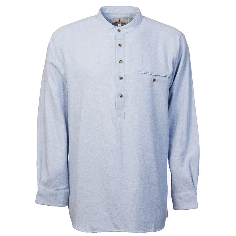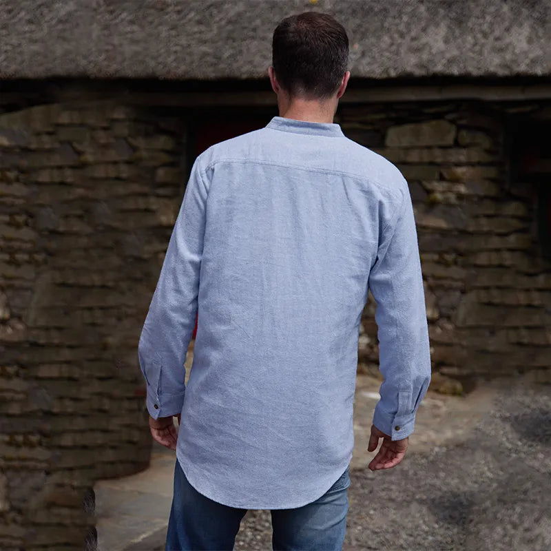 If you are looking for a piece to elevate your everyday style, this Irish Cotton Flannel Grandad Shirt in Blue might just be the perfect choice! It is excellently crafted from 100% cotton, a lightweight, durable, and comfortable material that is suitable for daily activities or even road trips. The shirt features a mandarin-style collar that can be worn closed or open due to the practical and stylish button system. The side button is great for placing everyday-use items and simply reaching them whenever needed. The rounded shirt hem is a timeless addition that brings a touch of sophistication and also ensures the shirt can be paired with formal and casual and make a good impression on any occasion. This grandfather shirt is a lovely addition to any summer wardrobe, especially for anyone wishing to bring a fun and versatile touch to their appearance.