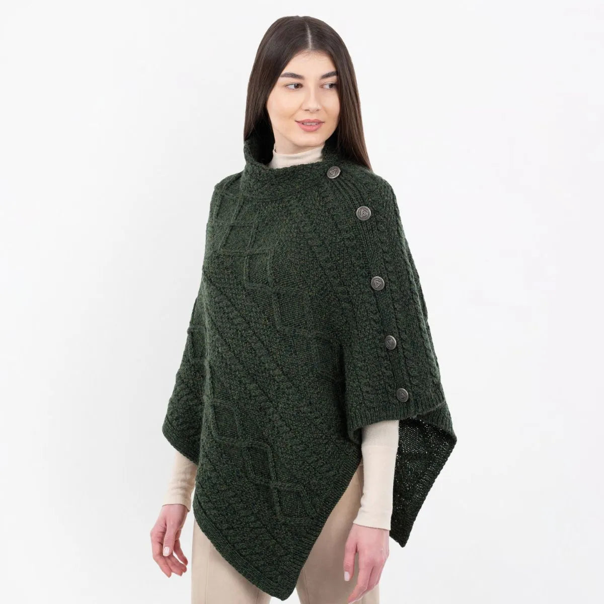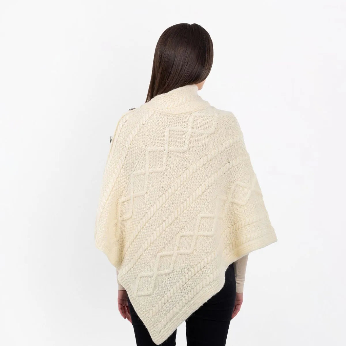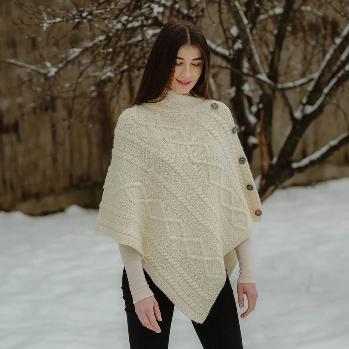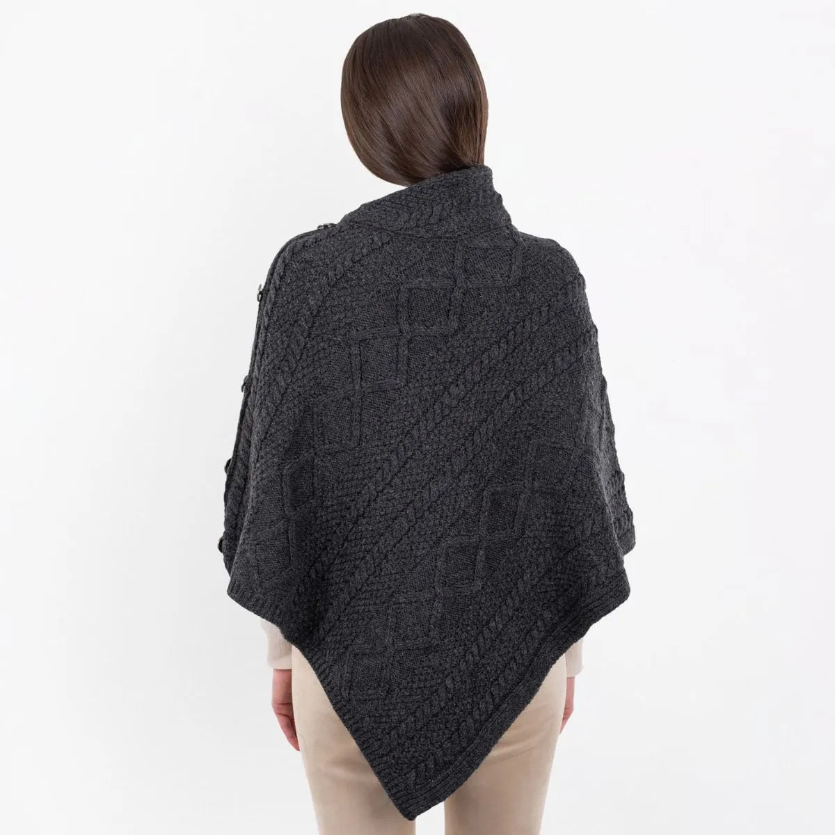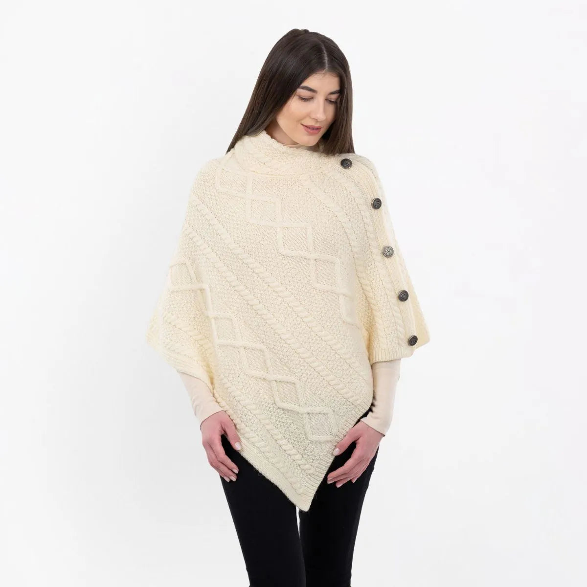 Wrap yourself in tradition with our beautifully crafted Celtic Knots Traditional Cowl Neck Poncho, a blend of heritage, elegance, and comfort. The design incorporates classic Aran stitch patterns, each carrying deep cultural symbolism. Cable stitches, inspired by fishermen's ropes, represent wishes of good luck and safety for the wearer, while moss stitches symbolize growth and abundance, reflecting Ireland's mossy cliffs. Made from 100% Merino wool, this poncho is luxuriously soft, breathable, and heat-insulating, ensuring year-round warmth and comfort. Its natural fibers also make it a sustainable choice for those who appreciate both quality and eco-conscious fashion. Thanks to Saol technology, this poncho is machine washable, an innovativefeature for wool garments, ensuring easy care without compromising its softness or durability. The cowl neck adds a refined touch, draping gracefully for both warmth and style, while the button detail enhances its sophisticated look. Whether worn casually over a shirt and jeans or paired with dressier outfits, this poncho seamlessly blends tradition with modern versatility. Whether you're looking for a cozy layering piece or a statement of Celtic tradition, this poncho is a timeless addition to any wardrobe.
