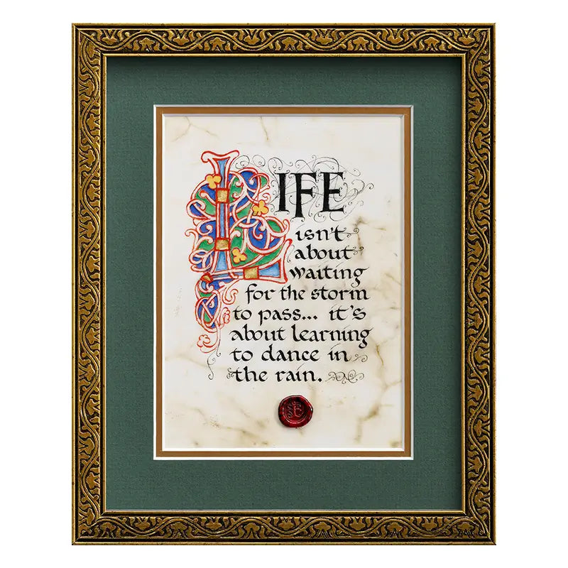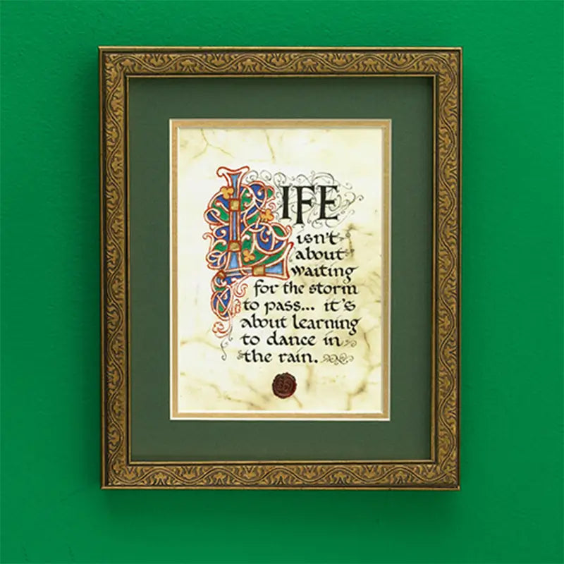 Elevate your home decor with our Dancing in the Rain Print, featuring a manuscript style print by renowned artist Kevin Dillon. This piece's design is inspired by the Book of Kells, and captures the essence of joy and spontaneity, inviting viewers to embrace life's moments of pure bliss, even in challenging situations. Dillon's evocative words remind us to find happiness in every circumstance. The print is hand-lettered on premium calfskin vellum enhancing its aesthetic appeal and durability, making it a lasting addition to your collection. The meticulous attention to detail in the hand-lettering reflects authenticity, and Dillon's commitment to artistry. The print is housed in an elegant double-matted presentation within a gilded frame. The overall dimensions of the piece are 9 inches wide by 11 inches high, making it a perfect focal point for any room. For your convenience, the print comes ready to hang, complete with a hook attached to the back. This thoughtful feature allows you to easily display your artwork and enjoy the inspiring message. Enhance your space with this uplifting and beautifully crafted piece.