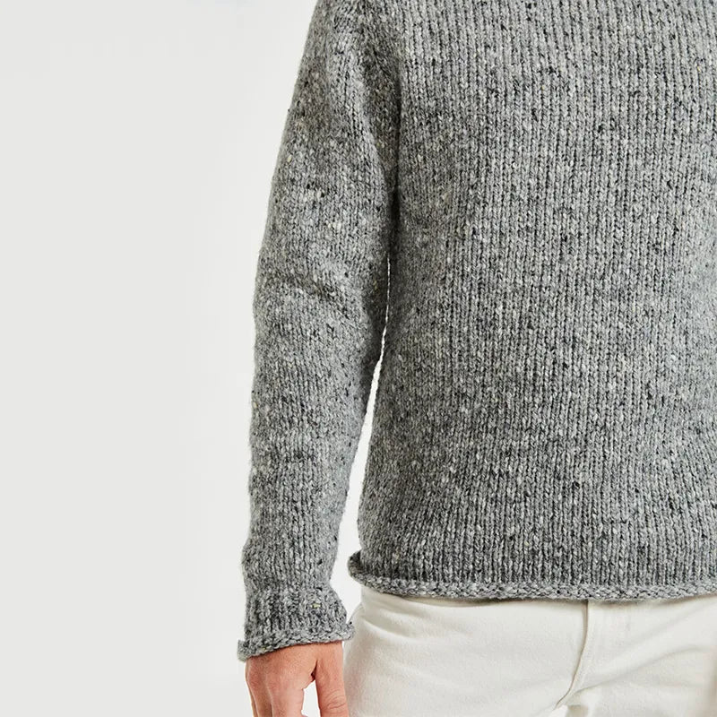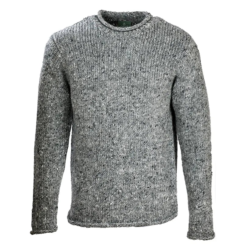 Elevate your style with our Donegal Wool Roll Neck Sweater, a tribute to Irish tradition. Crafted in Ireland, this sweater embraces the rich heritage of 100% Donegal Tweed Wool, known for its exceptional warmth, durability, and softness. This sustainable and breathable material ensures year-round comfort. The distinctive Donegal Tweed texture, with tiny flecks in alternating hues, brings a touch of Irish charm. The fully linked seams showcase sophisticated craftsmanship, while the rolled crew neck, ribbed cuffs, and hem offer both functionality and elegance. Whether you dress it up with slacks or down with jeans, this sweater adds refinement to any wardrobe. Embrace the warmth, comfort, and Irish heritage of this men's Aran fisherman sweater, a timeless statement piece.