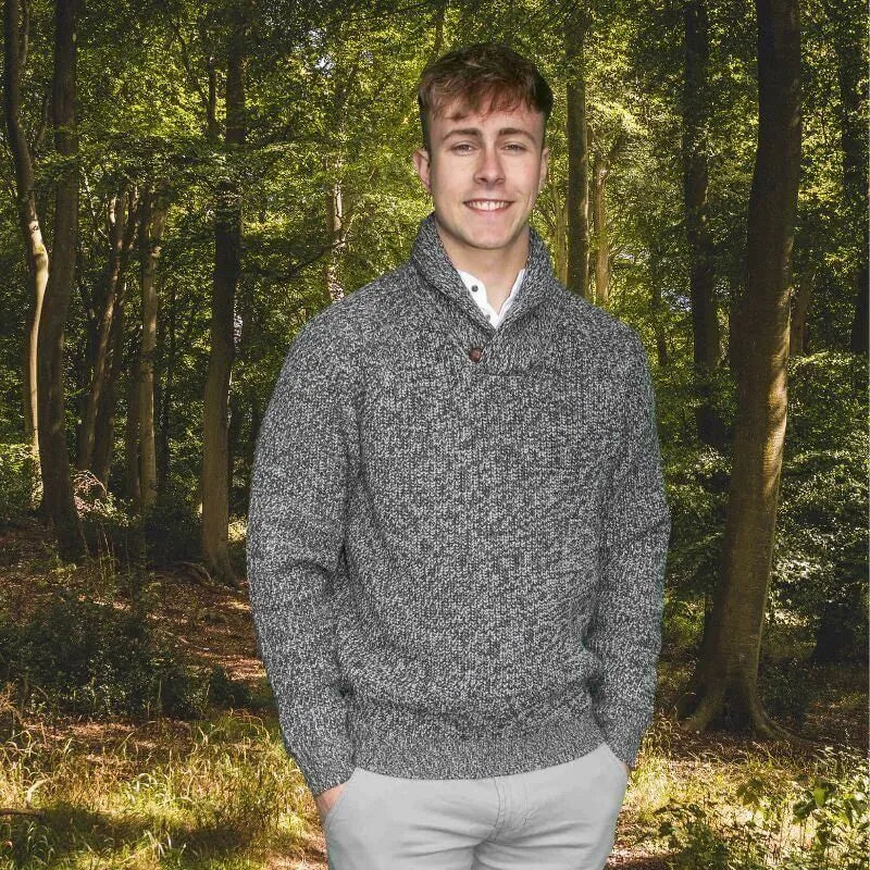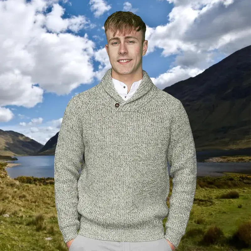 Our Men's Buttoned Shawl Neck Aran Fisherman Sweater showcases the enduring style of traditional Irish knitwear. Reminiscent of the rugged sweaters worn by Irish fishermen and inspired by the scenic beauty of Kells Bay, this sweater embodies Ireland's spirit, weaving together stories of maritime adventures and the land's rich heritage. This garment is crafted of a soft, durable wool blend that offers exceptional warmth and insulation. One of the best things about this wool blend is how easy it is to care due to the wrinkle-resistant properties. The durability of the wool blend ensures that the sweater maintains its sharp look and feel for years to come. This combination of softness, warmth, and practicality makes this sweater a standout choice for style and function. The classic shawl collar, enhanced by a single football button, adds a touch of versatility to the sweater's design. Whether layered over a crisp white shirt for a polished look or worn with jeans for a relaxed outfit, this sweater seamlessly blends classic and contemporary styles. This men's Aran fisherman sweater is a meaningful gift choice that celebrates Irish craftsmanship and tradition. Perfect for birthdays, anniversaries, or special occasions, it's a cherished addition to a dear man's wardrobe, offering warmth and a touch of authentic Irish charm.Â