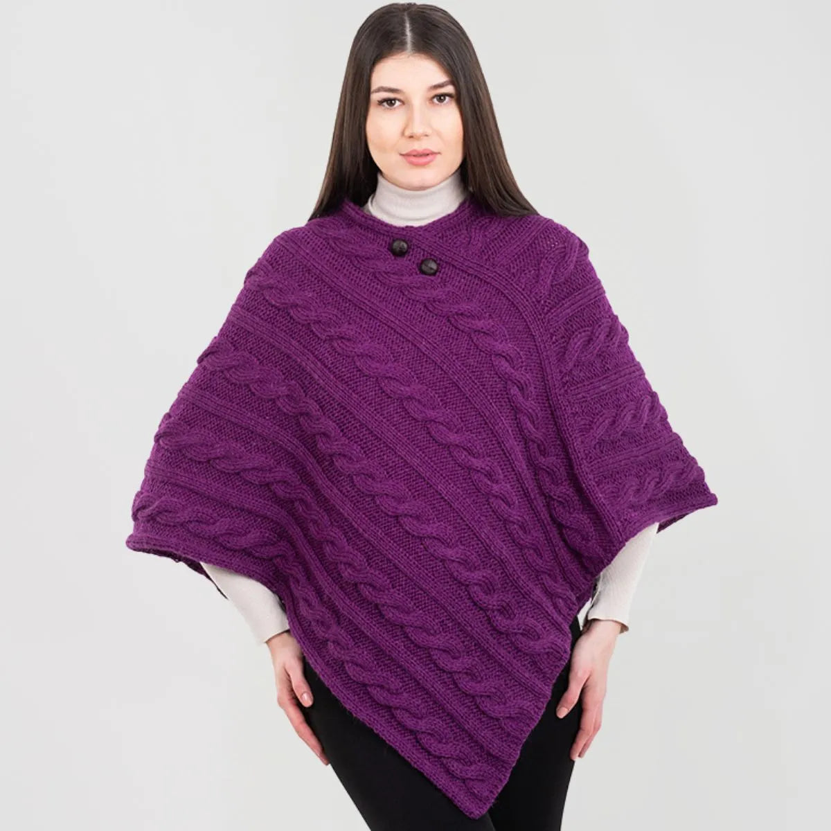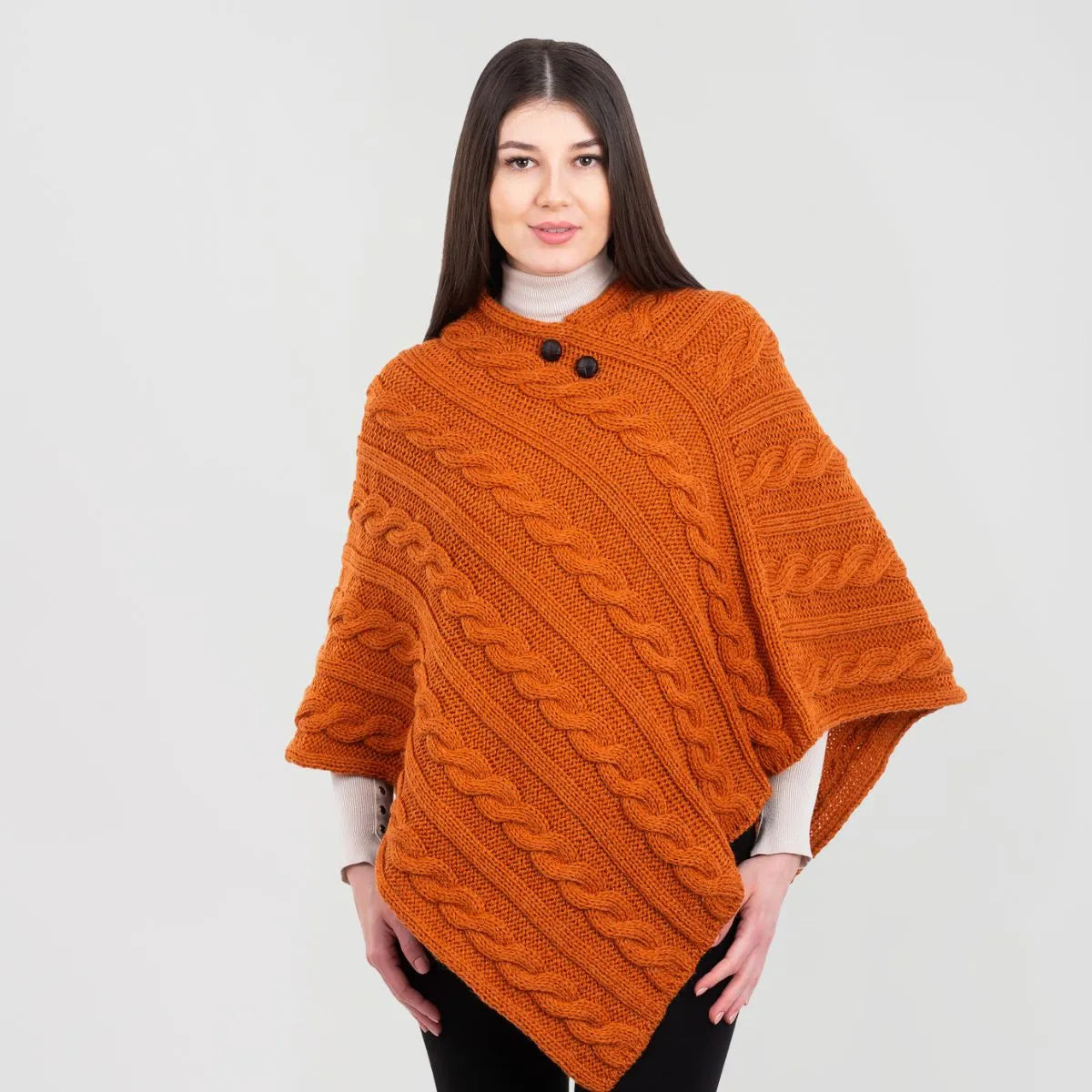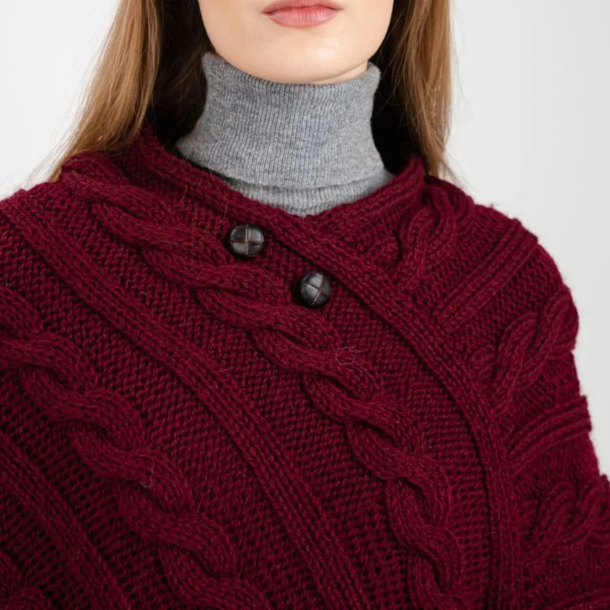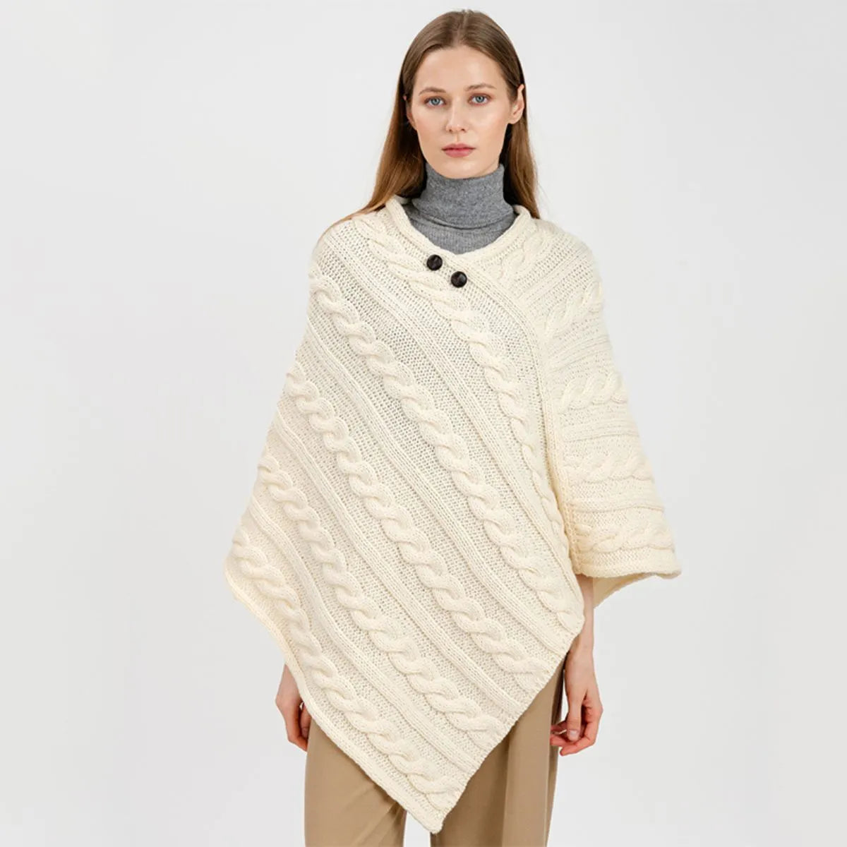 For centuries, the rugged Irish coastline has inspired some of the most beautiful knitwear in the world, and this Fisherman Wool Buttoned Aran Poncho is no exception. The classic cable stitch featured on this poncho, once handwoven into sweaters by the wives and mothers of Irish fishermen, was believed to offer protection and good fortune at sea. Today, it remains a symbol of strength and resilience, giving this poncho both meaning and timeless charm. While the intricate knitwork gives it a rich texture and stylish appeal, the design serves a purpose beyond aesthetics. Originally, these stitches were crafted for breathability and insulation, helping fishermen withstand the harsh Atlantic winds. This poncho is made with that same time-honored technique, ensuring comfort in any season. Crafted from 100% virgin wool, this poncho offers softness, warmth, and durability, all while being moisture-wicking to keep you comfortable throughout the day. Designed in a flattering V-shape, it closes with two football buttons right under the neckline. Sleeveless for ease of movement, it's perfect for layering over a blouse or sweater for a cozy, effortlessly chic look. Expertly made in Ireland, this poncho is a true piece of Irish craftsmanship!