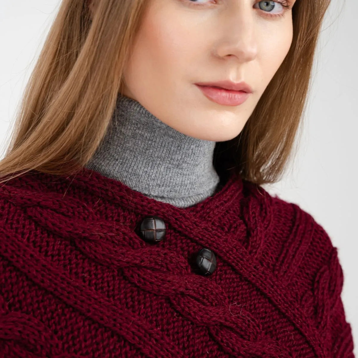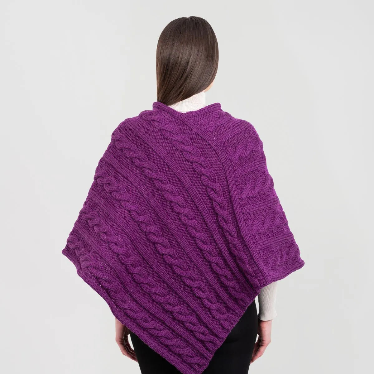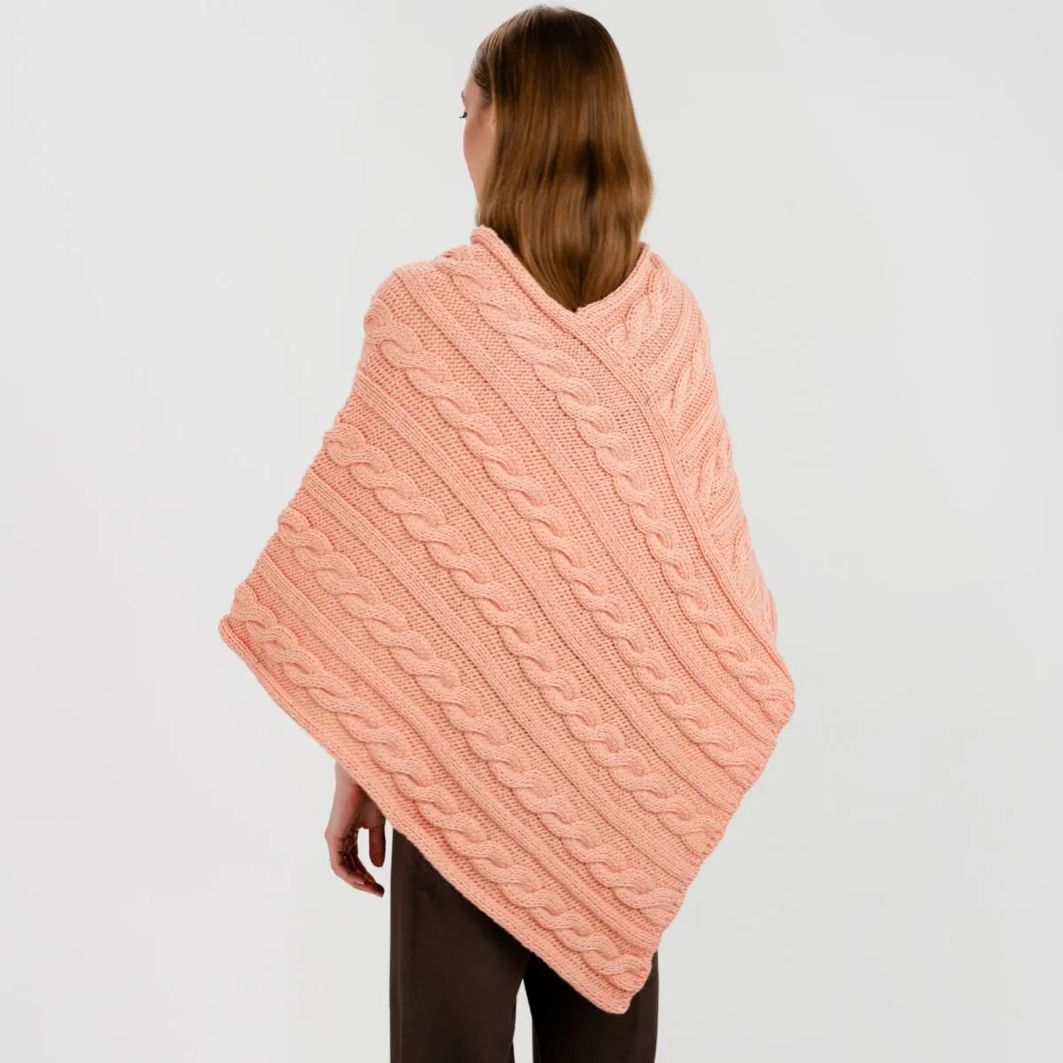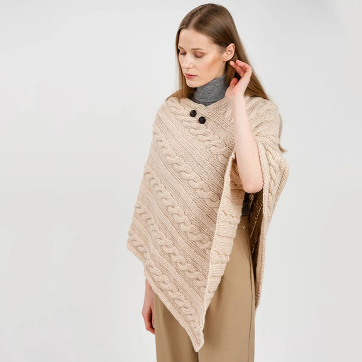 For centuries, the rugged Irish coastline has inspired some of the most beautiful knitwear in the world, and this Fisherman Wool Buttoned Aran Poncho is no exception. The classic cable stitch featured on this poncho, once handwoven into sweaters by the wives and mothers of Irish fishermen, was believed to offer protection and good fortune at sea. Today, it remains a symbol of strength and resilience, giving this poncho both meaning and timeless charm. While the intricate knitwork gives it a rich texture and stylish appeal, the design serves a purpose beyond aesthetics. Originally, these stitches were crafted for breathability and insulation, helping fishermen withstand the harsh Atlantic winds. This poncho is made with that same time-honored technique, ensuring comfort in any season. Crafted from 100% virgin wool, this poncho offers softness, warmth, and durability, all while being moisture-wicking to keep you comfortable throughout the day. Designed in a flattering V-shape, it closes with two football buttons right under the neckline. Sleeveless for ease of movement, it's perfect for layering over a blouse or sweater for a cozy, effortlessly chic look. Expertly made in Ireland, this poncho is a true piece of Irish craftsmanship!