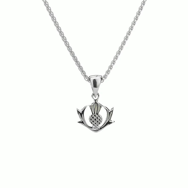 Imbued with the rich symbolism of Scottish heritage, this Silver Flower of Scotland Pendant encapsulates the legendary tale of valor and resilience. Crafted from 100% sterling silver, this elegant pendant is durable, rust-resistant, and has a lustrous shine. This piece portrays the iconic thistle motif, symbolizing Scotland's triumph over adversity. According to legend, a sleeping party of Scottish warriors was spared from ambush by an invading Norse army when one of the attackers inadvertently stepped on a thistle, alerting the Scots to the danger. With dimensions of 1/2" width and 3/4" height and with an 18-inch chain, this href="https://www.gaelsong.com/prod_detail_list/jewelry-celtic-pendants" Celtic pendant is ideal for everyday wear.