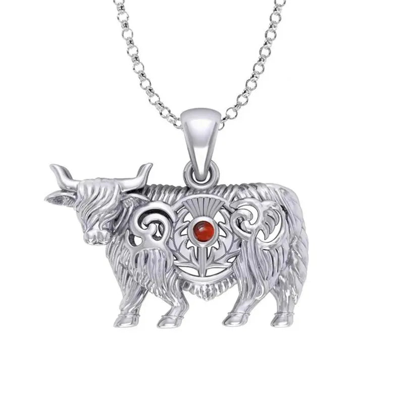 J24439GG Highland Cow Thistle Pendant with Gemstone Red Color Gaelsong