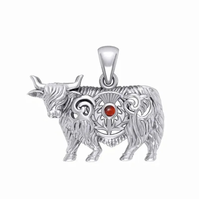 J24439GG Highland Cow Thistle Pendant with Gemstone Red Studio  Gaelsong