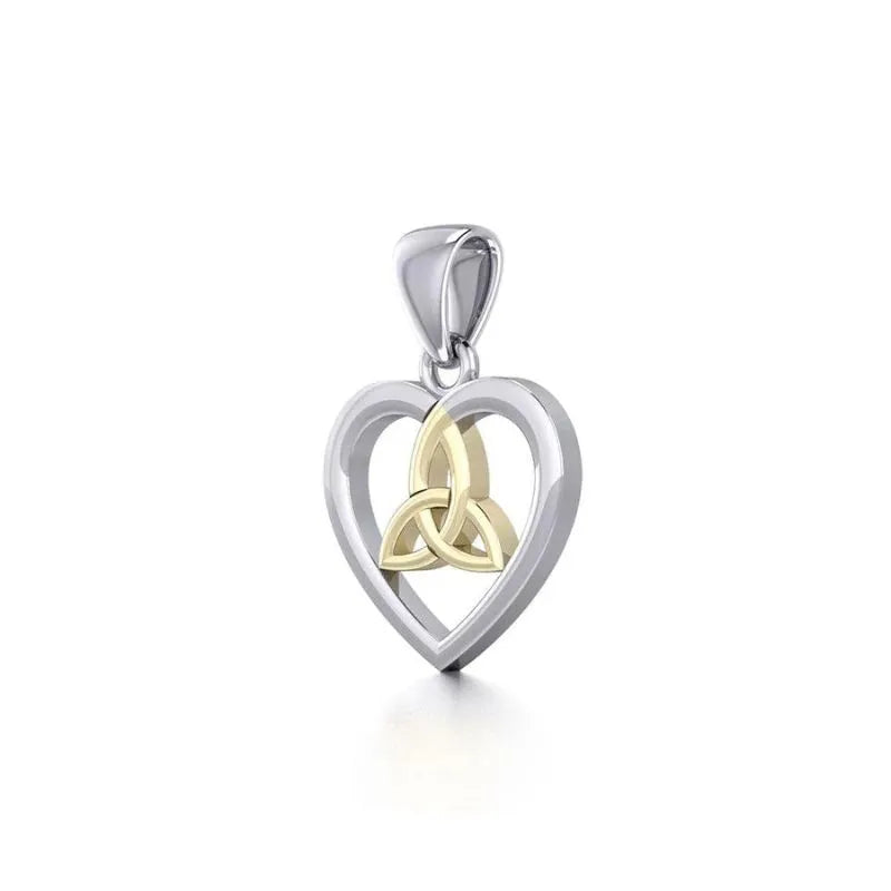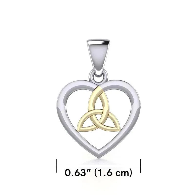 This exquisite Heart Shaped Trinity Knot Pendant encapsulates the rich heritage of Celtic culture in a timeless piece of jewelry. This pendant is meticulously crafted from 925 sterling silver with captivating 14 K. gold accent, adding a touch of elegance, durability, rust resistance, and luxury. At its core lies a heart intertwined with a golden trinity knot, symbolizing interconnectedness, eternity, and the enduring bond of love. Measuring 0.62 inches in width and 0.86 inches in height, this pendant embodies delicacy and charm. The inclusion of an 18-inch chain ensures versatile wearing options, allowing it to be effortlessly integrated into any ensemble.
