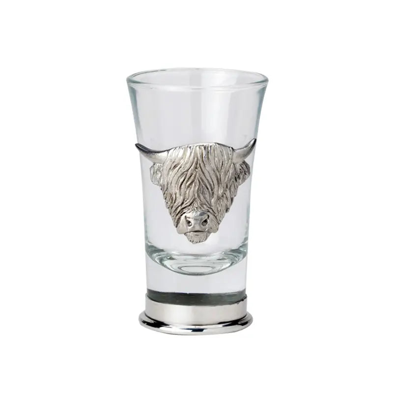 Our Embossed Highland Cow Shot Glass is the perfect gift for any lover of fine liqueur and Scottish culture. This product features the finest and most resistant glass with handcrafted pewter detailing. It also features a Highland cow design, an iconic and greatly beloved animal that animates the Scottish landscapes. The Scots love this cattle breed because of its gentle and friendly nature, as well as for its cute appearance. They are very wooly, hardy, and they even have horns! Holding 2 oz, our Highland Cow Shot Glass is the perfect way to down your drink.