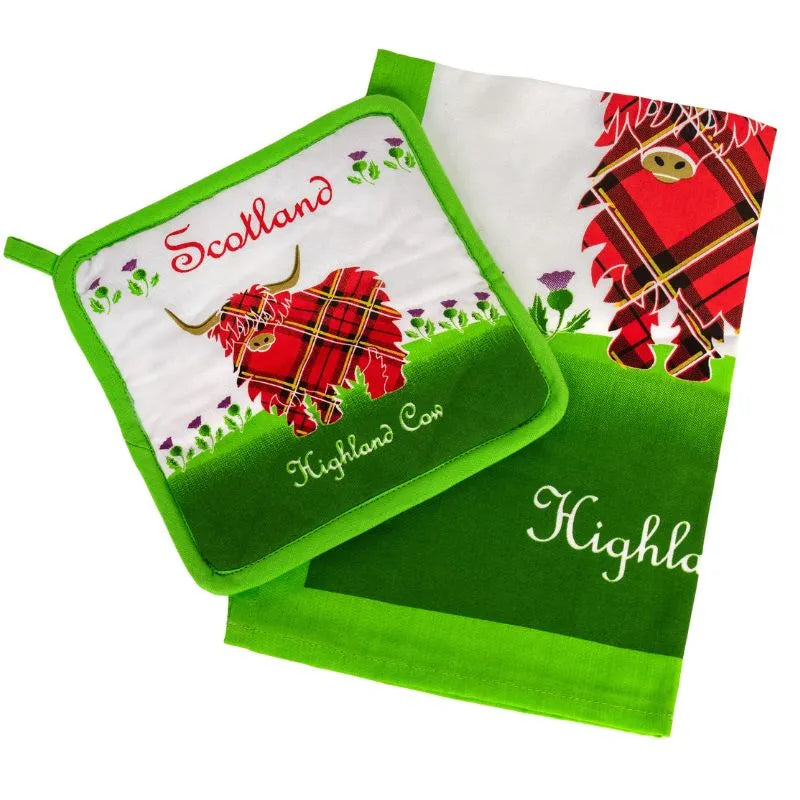Our Highland Cow Cotton Tea Towel Set brings a little bit of Scotland into the kitchen. You can choose the simple beauty of the single tea towel or the full matching two-piece set, each item feels like a small celebration of Scottish countryside life. Made from 100% cotton, the material is soft and breathable in that comforting, familiar way that good kitchen textiles should be. It absorbs well, dries quickly, and stands up to daily use. The design is what really makes this set special. The Highland Cow takes center stage with all its shaggy charm, that unmistakable sweep of red hair and the gentle expression that people fall in love with instantly. Around it, you'll notice the purple Scottish thistle and touches of tartan, little nods to heritage that make your kitchen feel warmer, cozier, and just a bit more personal. The tea towel is sized at 26.3" by 17.7", which makes it perfect for drying dishes, covering warm bread, or simply hanging near the sink for some Scottish charm. The matching pot holder measures 8.7" x 8.7", turning everyday chores into small moments of Scottish cheer. It adds a soft, rustic charm to any kitchen and makes even the simplest tasks feel a little more homely. And if you love the Highland Cow motif, you'll absolutely adore our Highland Cow Porcelain Mug.