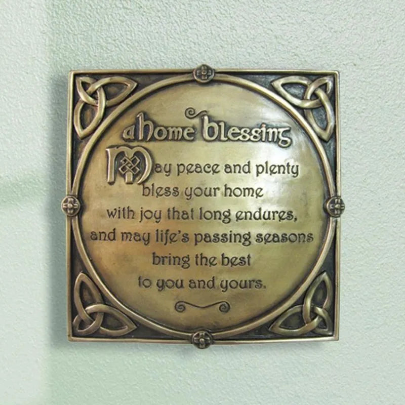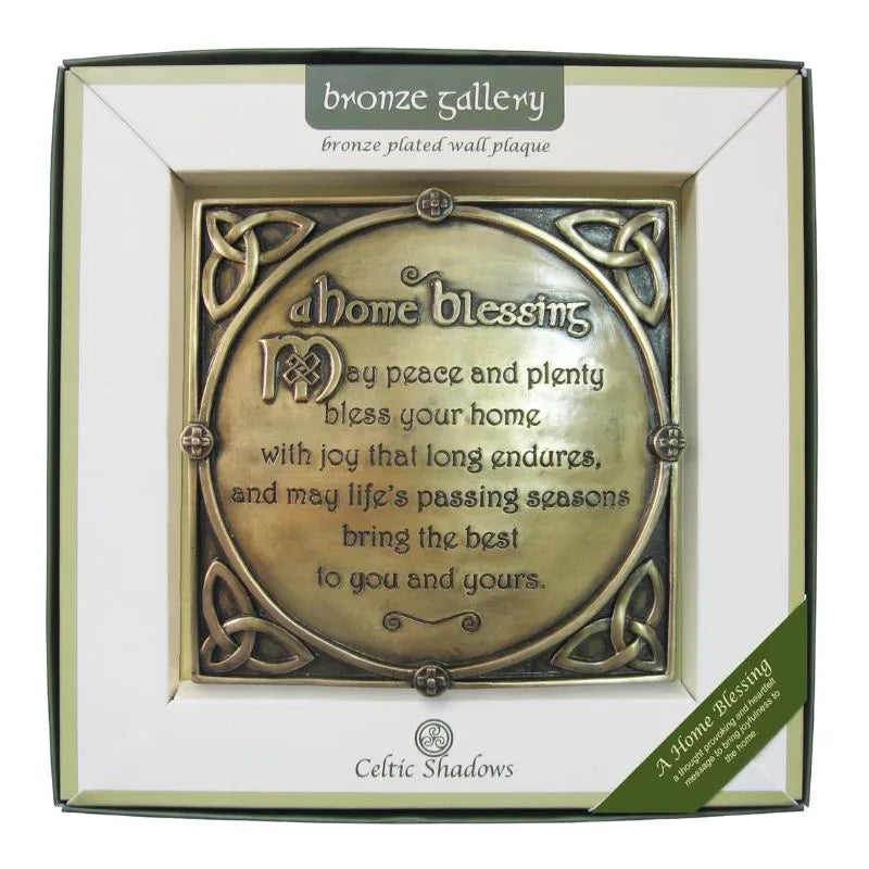 Bring an ancient Gaelic blessing into your home with our beautifully crafted Antique Irish Home Blessing Plaque. Featuring an engraved Irish blessing and embossed Trinity knot design, this plaque adds cultural heritage and authentic Celtic charm to any space. It's iscribed with the timeless words: 'May peace and plenty bless your home with joy that long endures, and may life's passing seasons bring the best to you and yours' - a thought provoking and heartfelt message to bring joyfulness to your home. As for the Trinity knot, it represents eternity and the interconnectedness of life, love, and faith, making it a truly meaningful emblem. This exquisite plaque is meticulously bronze-plated, ensuring long-lasting beauty and a rich, warm patina that will enhance any decor. The durable, rust resistant construction ensures that this cherished piece will remain a treasured part of your home for generations. Measuring 5.90"" H x 6.10"" W, this Irish plaque is perfectly sized to make a statement. Check out our Irish-themed wall art and candles for an added touch of traditional charm to your home. Boxed and ready to give, this plaque makes a thoughtful and cherished gift for housewarmings, weddings, or as a treasured addition to your own decor.