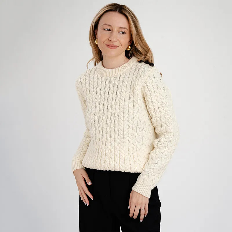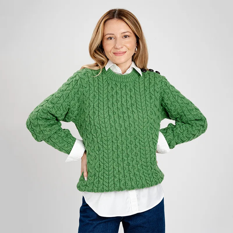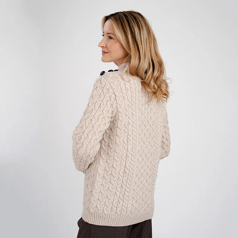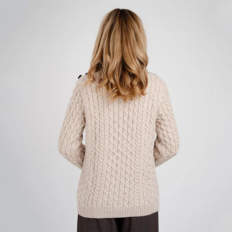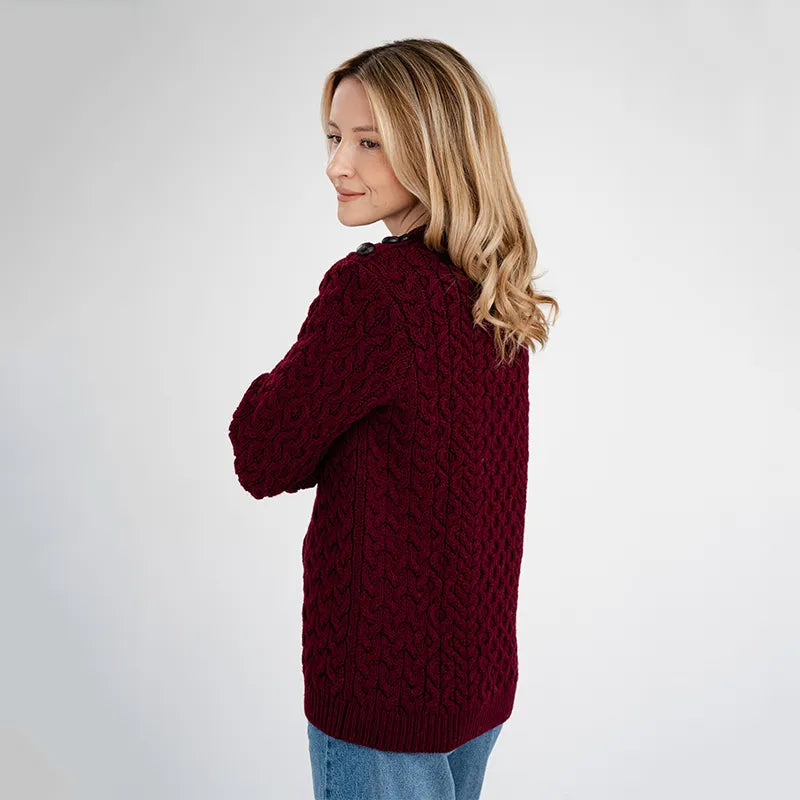 Stay stylish and warm while honoring your culture this season with our Side Button Honeycomb Irish Sweater. Made out of 100% merino wool, this sweater is super soft to the touch, it will keep you warm while also ensuring breathability. To make sure you enjoy this piece for a long time, hand wash only with cold water and dry it flat on a horizontal surface. Designed with traditional Aran honeycomb and rope stitches, this sweater honors Irish culture and symbolizes good fortune, hope, and safety. In addition to the unique stitches, the sweater has three wooden buttons on the side, adding more style to it. Check out our collection of women's sweaters and cardigans to find the best fit and style.