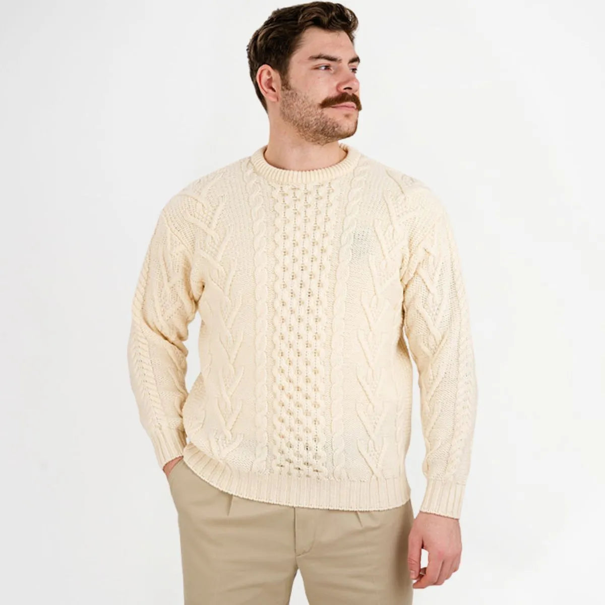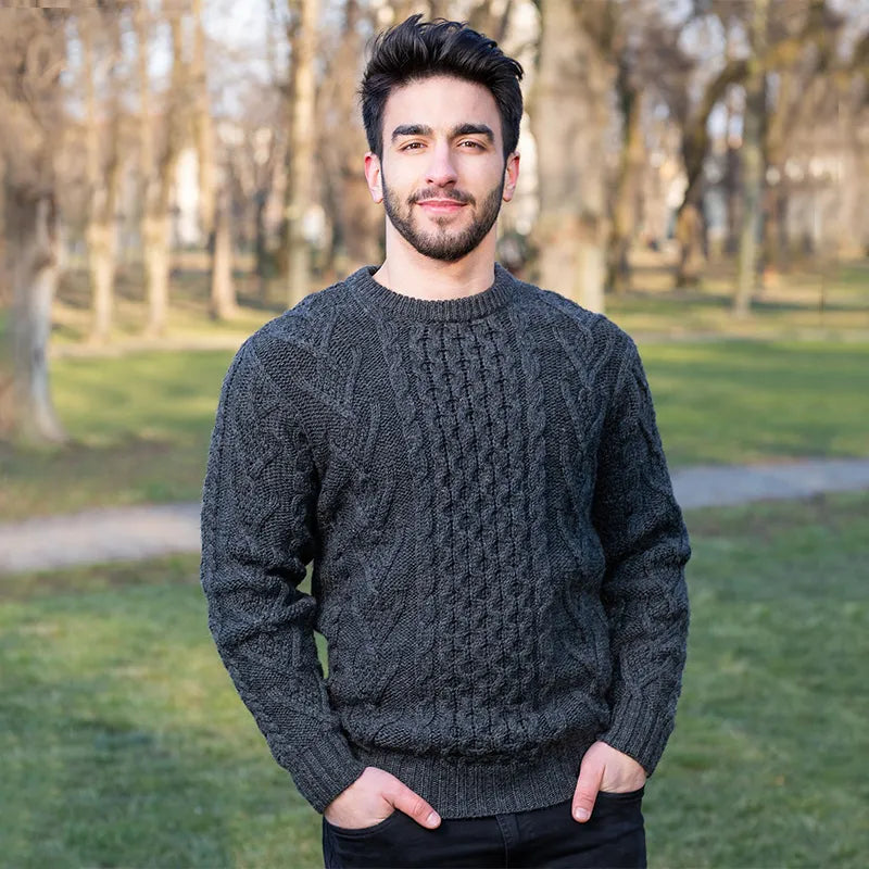 Our Men's Irish Aran Sweater is a classic addition to any wardrobe and a best seller from our  men's sweaters selection. It is made of 100% Merino Wool, which is breathable, warm, and luxurious. It features intricate Aran honeycomb, cable and moss stitching, which originated in the Aran Islands off the west coast of Ireland. The sweater has a crew neck collar, which gives it a contemporary look. With a rich history and modern twist, our jumper is a timeless addition to your wardrobe and symbol of Ireland's past and present.
