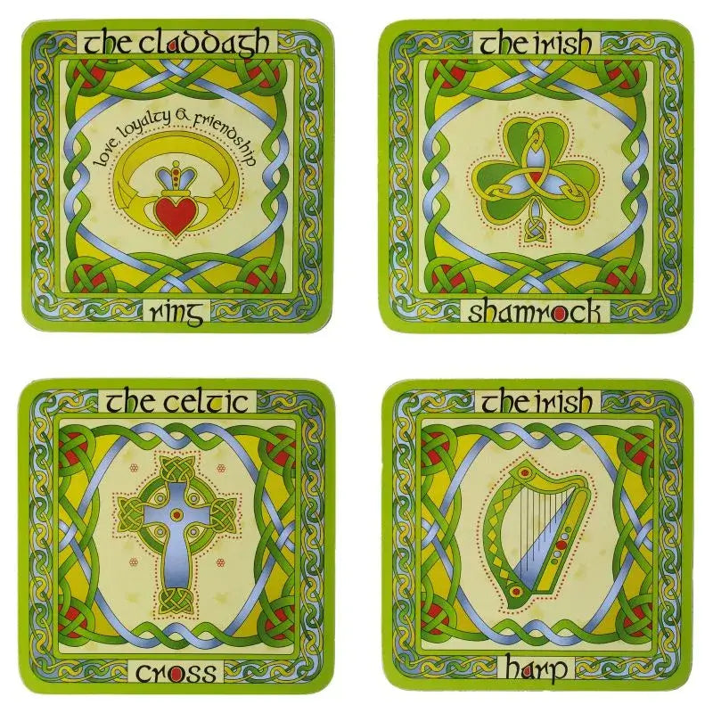 Bring a touch of Irish charm to your home with this Assorted Irish Designed Coasters Set of 4! Each coaster in this beautiful set features a unique symbol of Ireland - the Claddagh Ring (representing love, loyalty, and friendship), the three leaf Shamrock (alluding to the idea of Holy Trinity in Irish Christianity), the Celtic Cross (a representation of faith, hope, and Irish Christian heritage), and the Irish Harp (a nod to Ireland's rich musical history and the country's official symbol). All four designs are framed by intricate Irish weave patterns, linked to the ancient Celtic belief in eternity and the interconnectedness of all things. And while you're at it, check out our Kitchen and Glassware collection for more ways to bring an Irish touch to your home with so many matching designs! Crafted from wood with a cork backing, these coasters are built to protect your furniture from scratches, spills, and heat. Measuring 4.13"" square, they're the perfect size for everyday use - whether it's a morning coffee, an evening tea, or a well-earned pint. A fantastic Irish housewarming gift, this set is perfect for friends, family, or even as a little treat for yourself.