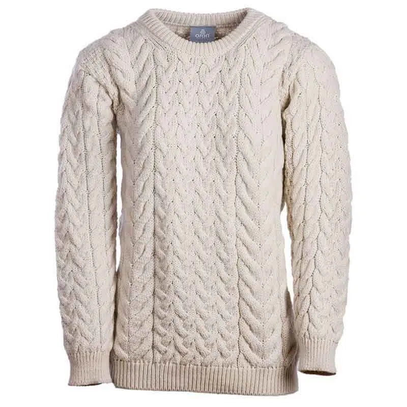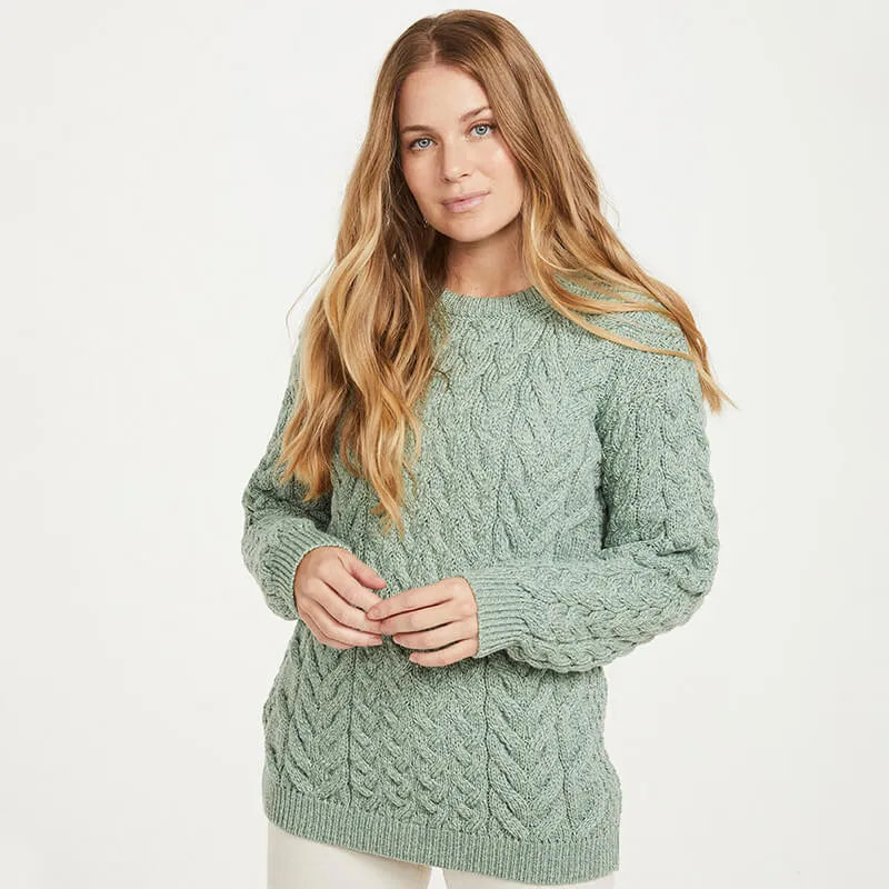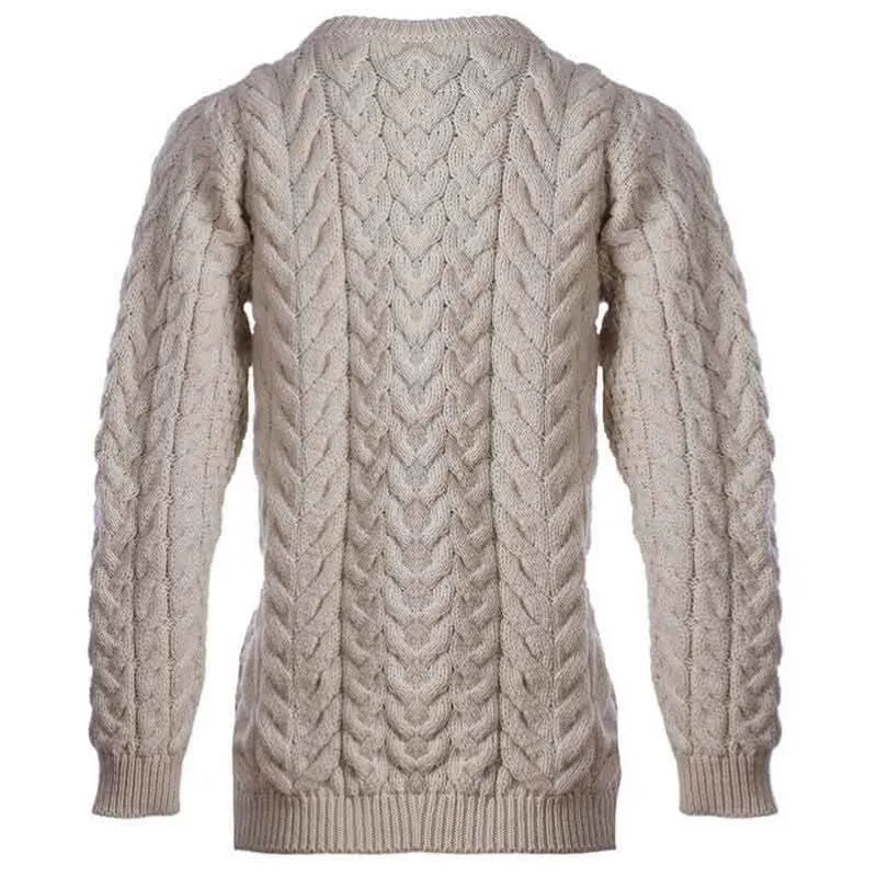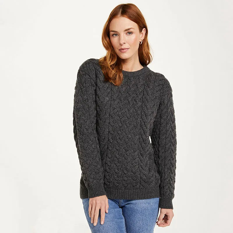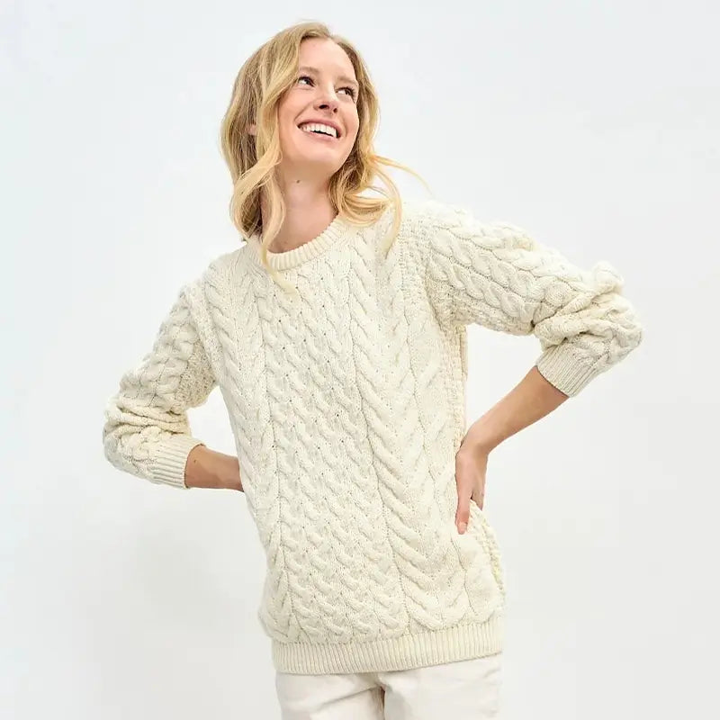 Our Ladies Cable Knit Irish Sweater makes the perfect companion for your daily adventures! What makes this Irish sweater special is its cultural design - it celebrates the ageless Aran knitting tradition through its classic cable & basket stitches. Originally, these Aran stitches were knit into fishermen's sweaters to add extra warmth, and as a wish for their safety. Carefully knit of 100% fine Merino wool, this Aran jumper is highly breathable, temperature regulating, and durable, guaranteeing all-year-round comfort - be it during a summer evening, or on a bitterly cold winter day. Tailored with cozy ribbing and a classic crew neck, this sweater provides a comfortable and versatile fit that can easily be dressed up or down. If you pair it with jeans, skirts, or leggings, it's the perfect piece to layer or wear on its own for effortless style. Made with love and care in Ireland by skilled artisans, this sweater honors centuries of Irish craftsmanship. Want to complete the look? Check out our range of scarves, hats, and gloves, designed to match perfectly with your new sweater and keep you warm and stylish all season long. Whether you're out for a stroll or lounging at home, this ladies Irish sweater will quickly become a go-to favorite in your wardrobe!
