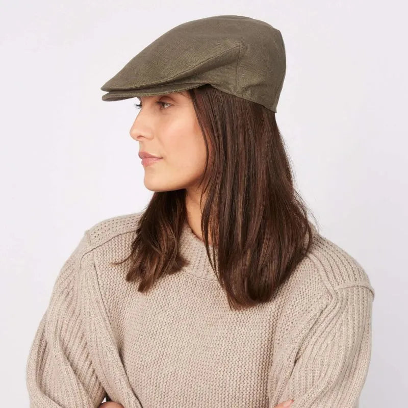 Our Ladies Irish Linen Vintage Style Flat Cap is a timeless staple, rooted in Ireland's rich tradition of flat cap craftsmanship. Worn for centuries, the classic Irish flat cap style has long been associated with Irish culture. Originally popularized in the 16th century when a law mandated the wearing of wool caps on Sundays and holidays, this stylish piece soon became a symbol of everyday Irish life. By the 20th century, the flat cap had evolved from a necessity to a fashion statement, remaining a beloved choice for those who appreciate classic style and heritage. Designed with a full-bodied fit, this cap maintains the authenticity of its predecessors while offering modern comfort and refinement. Featuring a flat peak with a concealed stud fastener, it provides a structured and polished silhouette. For a complete heritage-inspired look, we recommend our Handwoven Harris Tweed Satchel. Handmade in Ireland from 100% woven Irish linen, this cap is lightweight, breathable, and perfect for year-round wear. The high-quality viscose lining ensures a soft, luxurious feel against the skin.