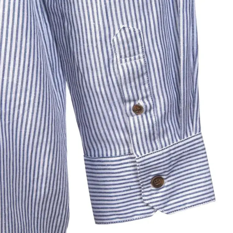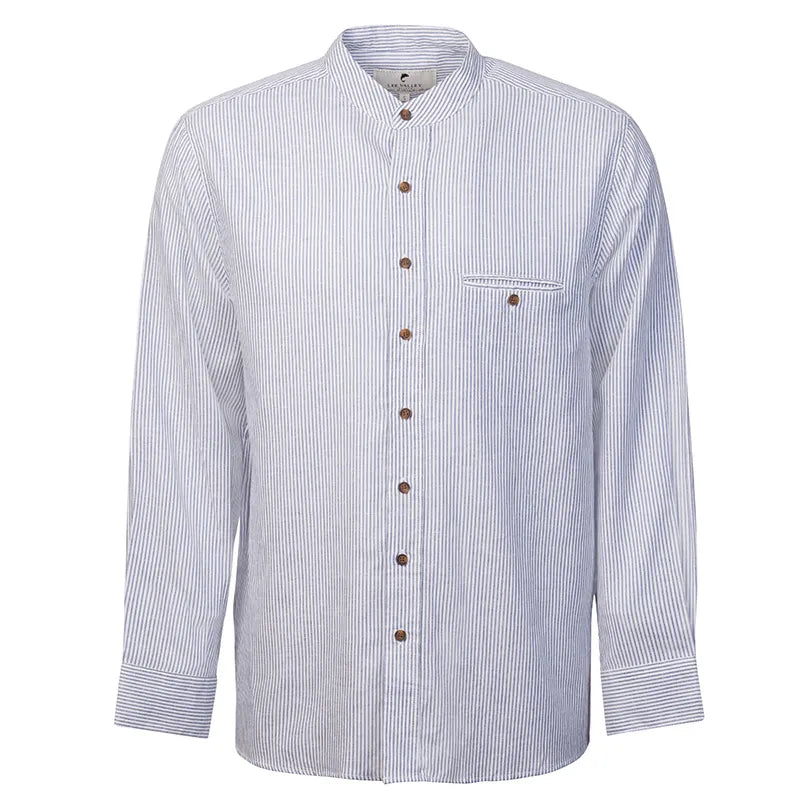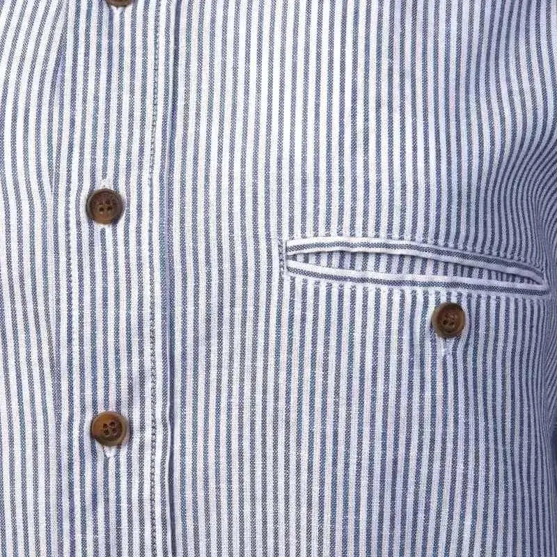 Keep soft while showing off your heritage with our Irish Linen Grandad Shirt in Navy Stripes. This Collarless Shirt is made out of high quality linen. The material is known for its breathability, long lasting durability and moisture resistance. Linen is combined with Cotton, which is also breathable, comfortable and extremely durable, soft to the touch being perfect to be worn in the warm season for many years to come. The exquisite Irish Linen Shirt has a grandfather classic design- collarless, buttoned up and long sleeved with a playful vertical white and navy stripes pattern, making it easy to wear and match. The classy shirt was wonderfully designed and made in Ireland. Enjoy the summer season by wearing this refined Irish Collarless Linen Navy and White Shirt!