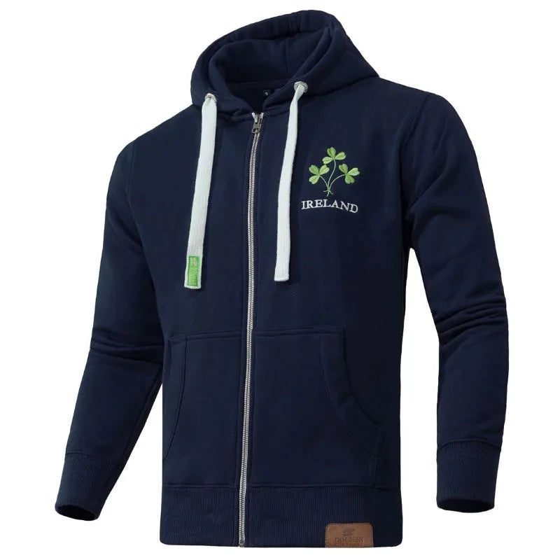 Our Shamrock Embroidery Irish Zippered Hoodie is made for anyone who wants to celebrate Irish heritage with subtle style and everyday comfort. Its standout design features three beautifully embroidered green shamrocks and a bold IRELAND embossment, a nod to the iconic symbol long associated with Saint Patrick and Irish identity, believed to represent luck, faith, and cultural pride. Adding to its charm, the hoodie includes an elegant "Sprig Ireland" embroidery on the left chest and a premium leather Dolmen Clothing® embossed patch on the hem. Crafted from a soft, insulating, and durable cotton blend, it feels cozy, resists wear and tear, and is easy to care for with simple machine washing. A practical drawstring hood, full zippered front, and two roomy pockets make it perfect for relaxed weekends, brisk walks, travel, or sporty days out. Pair this wardrobe favorite with selections from our entire Men's Irish Shirts collection for a complete heritage-inspired look.