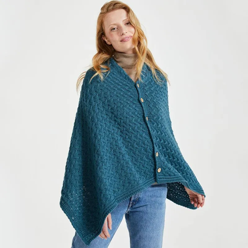 A10110 Color TEAL BLUE SuperSoft Merino Wool Irish Poncho with Buttons Gaelsong