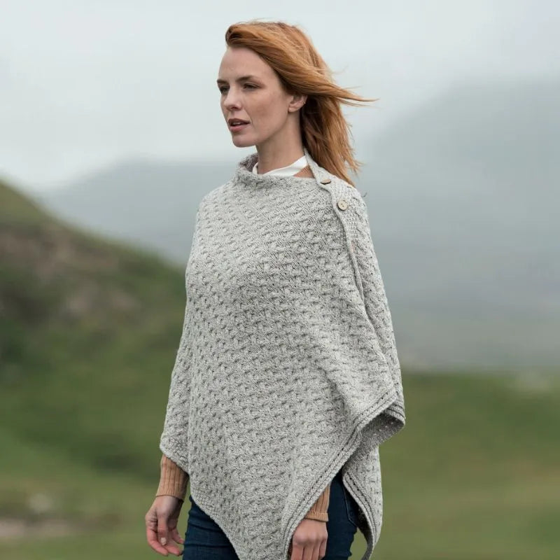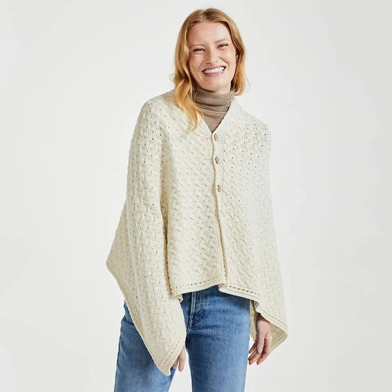 Welcome your new favorite: our SuperSoft Merino Wool Irish Poncho with Buttons! This gorgeous fusion of tradition and modern flair is set to become a staple in your wardrobe. The poncho features the classic Aran cable stitch, inspired by the intricate patterns found in fishermen's ropes, symbolizing good luck and protection. Complementing this is the beautiful moss stitch, which adds texture and symbolizes growth, renewal, and the lush landscapes of Ireland. Each stitch carries a little story from Irish folklore, making it a charming reminder of warmth and community. Crafted from 100% supersoft Merino wool, this Irish poncho feels like a cozy hug! Merino wool is an organic and ethically-sourced material, known for its exceptional softness -making this garment gentle against the skin, so you can wear it all day. It's naturally breathable, helping to regulate your body temperature, keeping you warm when it's chilly and cool when the weather warms up. Plus, it's moisture-wicking, so you can stay fresh and comfortable even during those active days-perfect for whatever the day throws your way! With its bold geometric shape, this stylish cape is a modern classic. It's effortlessly easy to layer over a simple tee or dress it up for a night out. The versatile boat neckline allows you to adjust your look, whether you want something casual or more refined. The stylish shoulder button detailing adds a playful touch that contrasts beautifully with the textured knit design. For an effortlessly chic vibe, pair it with your favorite hat! Whether you opt for a cozy beanie or a fashionable wide-brimmed hat, this poncho complements various headwear, enhancing your ensemble's warmth and flair. Wrap yourself in the charm of Irish craftsmanship with our Irish poncho that you'll cherish for years to come!