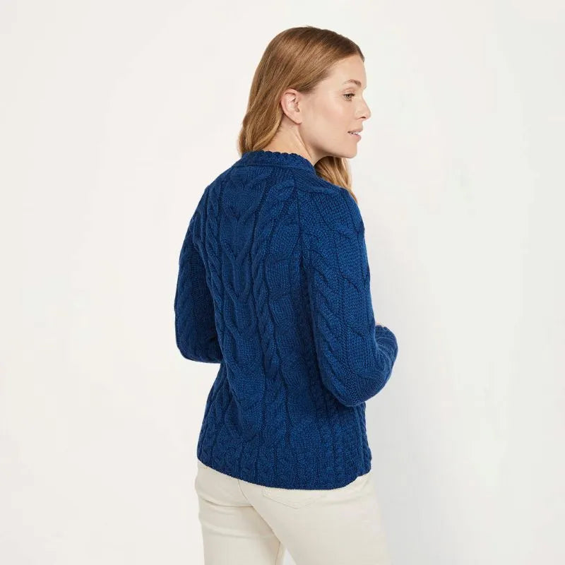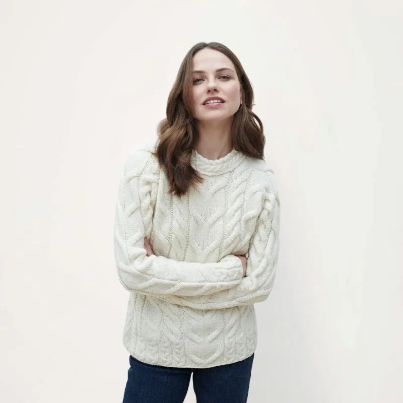 Ready to wrap yourself in comfort and tradition? Our SuperSoft Merino Cable Knit Aran Sweater is just what you need! This cozy piece showcases gorgeous Aran cable stitches that symbolize strength and unity, deeply rooted in Irish culture. Inspired by the ropes used by fishermen, these patterns were thought to bring good luck and ensure a safe return home after a long day at sea. Today, they represent hard work, prosperity, and, of course, they bring a bit of good fortune. You'll love the extra texture from the basket stitches that adorn the sides. These stitches are often linked to abundance and the richness of nature, reflecting a strong sense of community. The combination of flowing cable patterns and basket stitches really enhances the sweater's charm, making it a meaningful addition to your wardrobe. Crafted from 100% supersoft Merino wool, this sweater is stylish and incredibly comfy. Merino wool excels at regulating body temperature, keeping you warm without the risk of overheating. Its soft fibers feel gentle against the skin, making it ideal for all-day wear--whether you're running errands or relaxing at home. This yarn is naturally breathable, wicking away moisture to keep you feeling fresh throughout the day. With just the right amount of stretch, it ensures a comfortable fit that moves with you. Perfect for layering on a chilly outing or for a cozy evening in, this sweater offers luxurious softness alongside practical benefits, making it a must-have for your wardrobe. The classic crew neckline features a lovely braided cable design that adds a classy touch. The sleeves are attached in a cool raglan style, giving you the freedom to move around easily. With all these thoughtful design details, this oversized cable knit sweater is the perfect blend of tradition and modern flair. Proudly designed and made in County Mayo, Ireland, it embodies classic style and timeless elegance that you'll treasure for years to come.