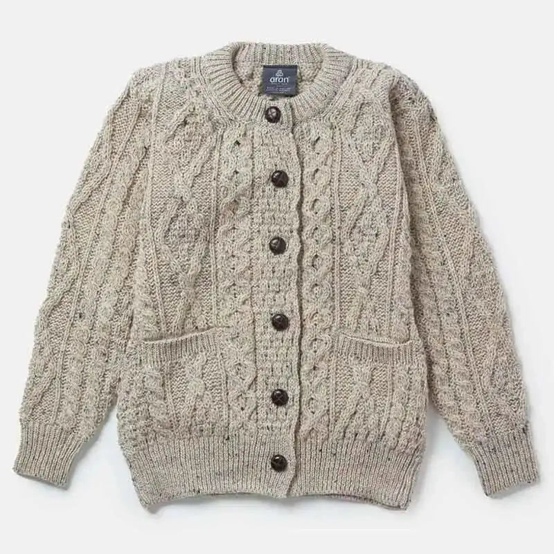 Looking for something with both warmth and a timeless Irish touch? Our Ladies Traditional Aran Lumber Jacket is your perfect match! This jacket beautifully combines heritage and style with its classic Aran stitches. The cable stitch represents the fishermen's ropes and is a wish for the wearer's safety and protection, while the basket stitch signifies a desire for a bountiful catch. You'll also find the diamond stitch - a symbol of good fortune -, and honeycomb patterns symbolizing the idea of sweet rewards after hard work. Not just beautiful, these stitches offer practical benefits too! Originally designed to keep Irish fishermen warm against the harsh Atlantic winds, Aran stitches are breathable yet insulating, making this jacket perfect for chilly days. Knitted in Ireland using traditional techniques, it provides optimal warmth without overheating - just what you need for unpredictable weather. This lumber jacket is made from 100% worsted wool, an organic yarn is incredibly durable and moisture-wicking, keeping you cozy through any season - making it perfect for layering. The jacket's design features a full-button front with football buttons, a classic crew neck, two front pockets for your essentials, and ribbed cuffs and hem for a snug fit. Styling? Pair it with a crisp white shirt for a polished look or lean into a cozy cottage-core aesthetic - this jacket is as versatile as it is timeless!