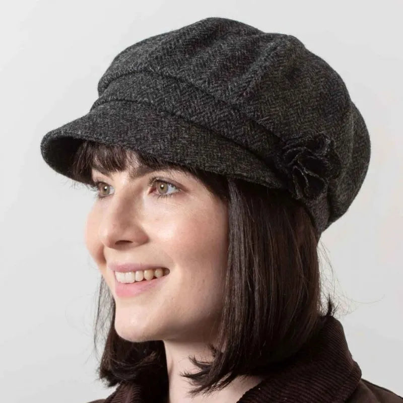 Step up your style game with a truly one-of-a-kind piece that's synonymous to Irish fashion! Our Pure Wool Ladies' Newsboy Cap brings together tradition and modern flair in one timeless accessory. Made by skilled artisans in County Galway, it's an authentic, beautifully crafted piece you'll love to reach out for season after season. This design stays true to its roots with its 6-panel crown, creating that signature volume that makes the newsboy-style unique, while the iconic short brim adds structure. But the real standout? A lovely tweed rose detail on the side, giving this cap a chic, feminine edge. Made from 100% pure new wool sourced in Ireland, this tweed is all about quality. Pure new wool means it's fresh from the sheep - never reused or recycled. It's durable, water-resistant, easy to care for, and guaranteed to last for many years to come. The quilted interior lining adds an extra layer of warmth and comfort, keeping your head dry and comfortable in all kinds of weather. Featuring a sophisticated charcoal herringbone pattern, long associated with success in Irish culture, this cap is a staple of Irish fashion. One-size-fits-all, this cap features an elasticated band at the back, ensuring a snug and comfortable fit for everyone. Whether you're wearing it all day or just for an outing, it stays perfectly in place while feeling great.