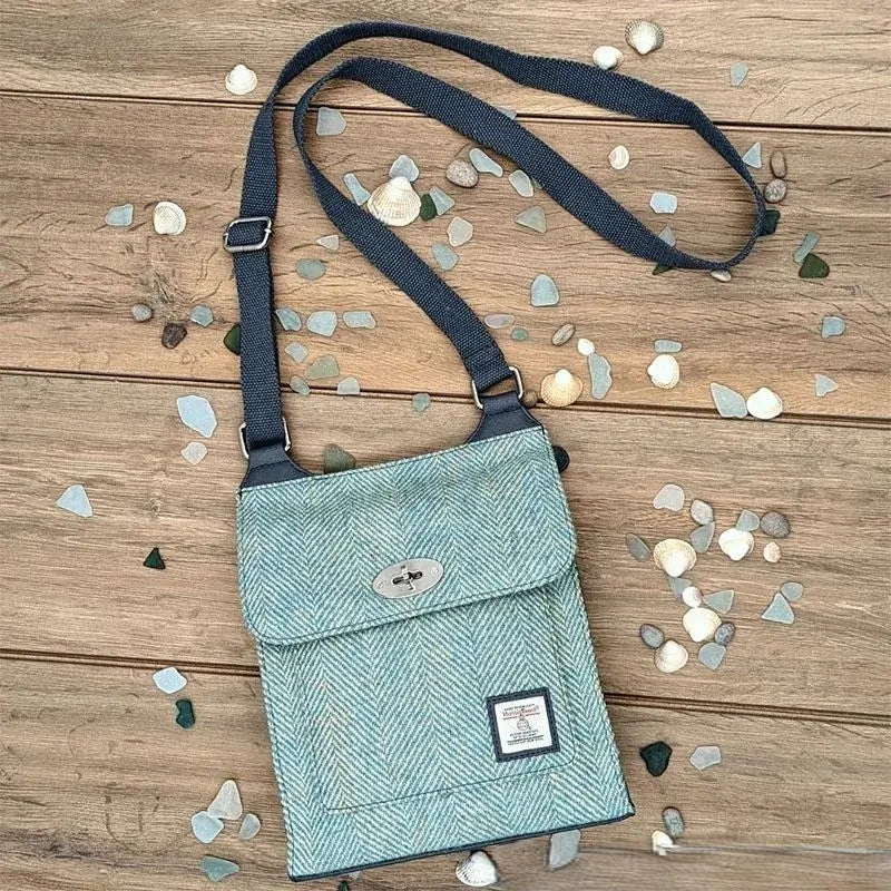 Elevate your everyday style with our Authentic Harris Tweed Purse for Ladies, a beautifully crafted mini satchel that pairs practical design with Scottish tradition. Made from 100% pure Harris Tweed, a material handwoven in the Outer Hebrides of Scotland, each bag carries the official Orb label stitched into the material, guaranteeing its authenticity. Harris Tweed is renowned for its durability and natural water resistance. It also features vegan leather trim, which varies in colour depending on the Harris Tweed you choose. Complete the look with our Ladies Tartan Harris Tweed Cap , perfectly paired for timeless, head-to-toe charm. The purse features classic Scottish patterns, with timeless tartans and herringbone patterns reflecting centuries of tradition. Each design is unique, rooted in a textile history that speaks of clans, landscapes, and local craftsmanship. Designed with everyday use in mind, the mini satchel includes a long adjustable crossbody strap for comfort and convenience. Inside, you'll find practical storage with well-placed compartments, including inner zipped pockets for small essentials. A slip pocket on the front and a secure zip pocket on the back make it easy to access your phone, cards, or keys on the go. Measuring approximately 9.84" x 8.66" x 2.36", it's the ideal size for daily errands, casual outings, or travel.