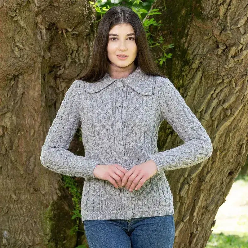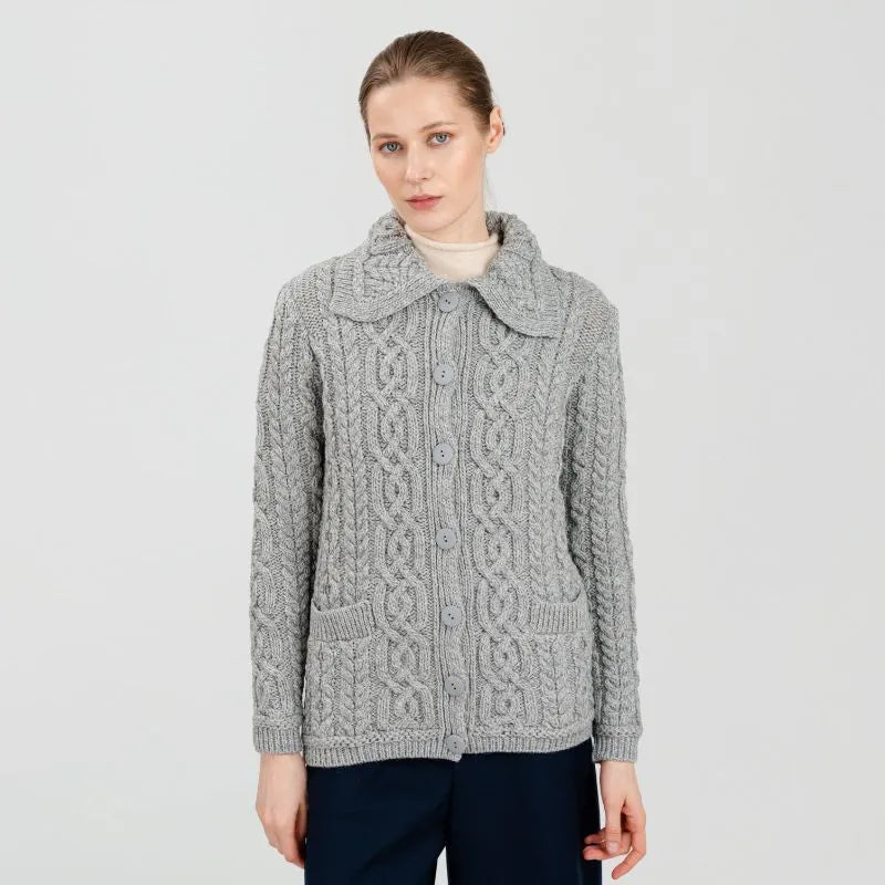 A20295 Ladies Aran Cable Knit Button Cardigan Grey Color Studio Gaelsong