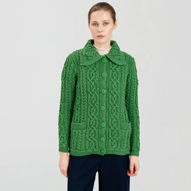 A20295 Ladies Aran Cable Knit Button Cardigan Green Color Studio Gaelsong