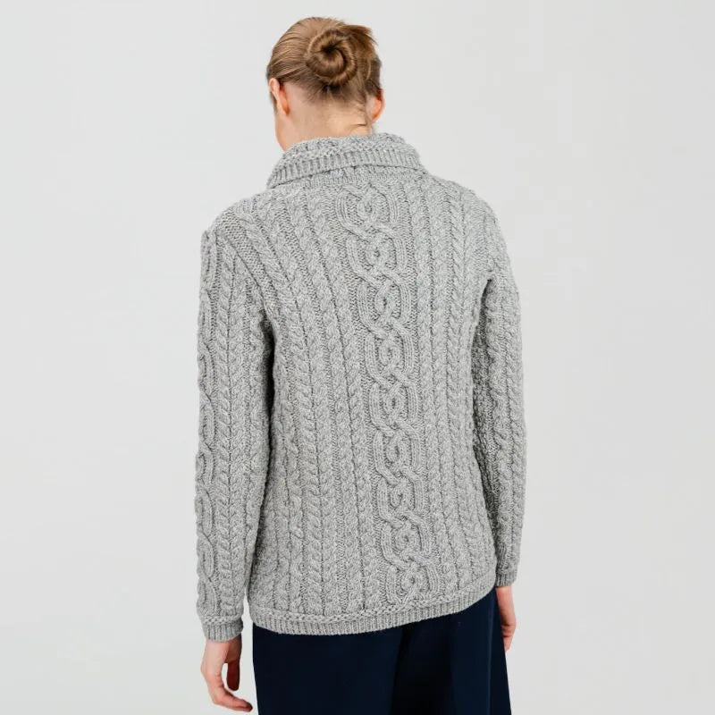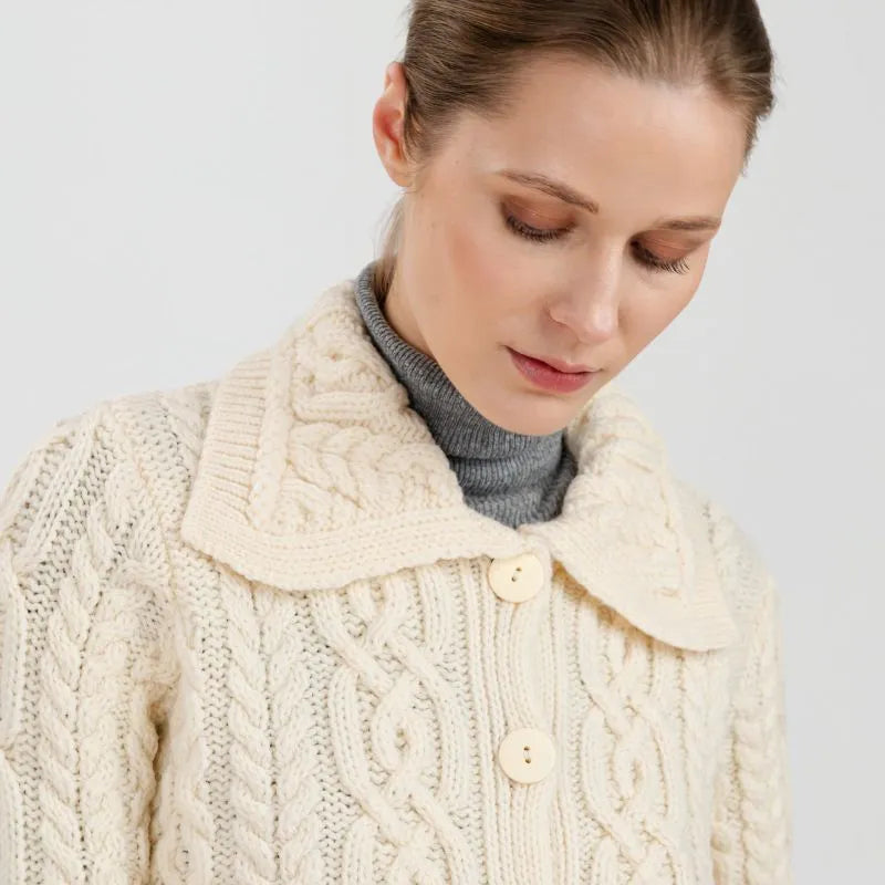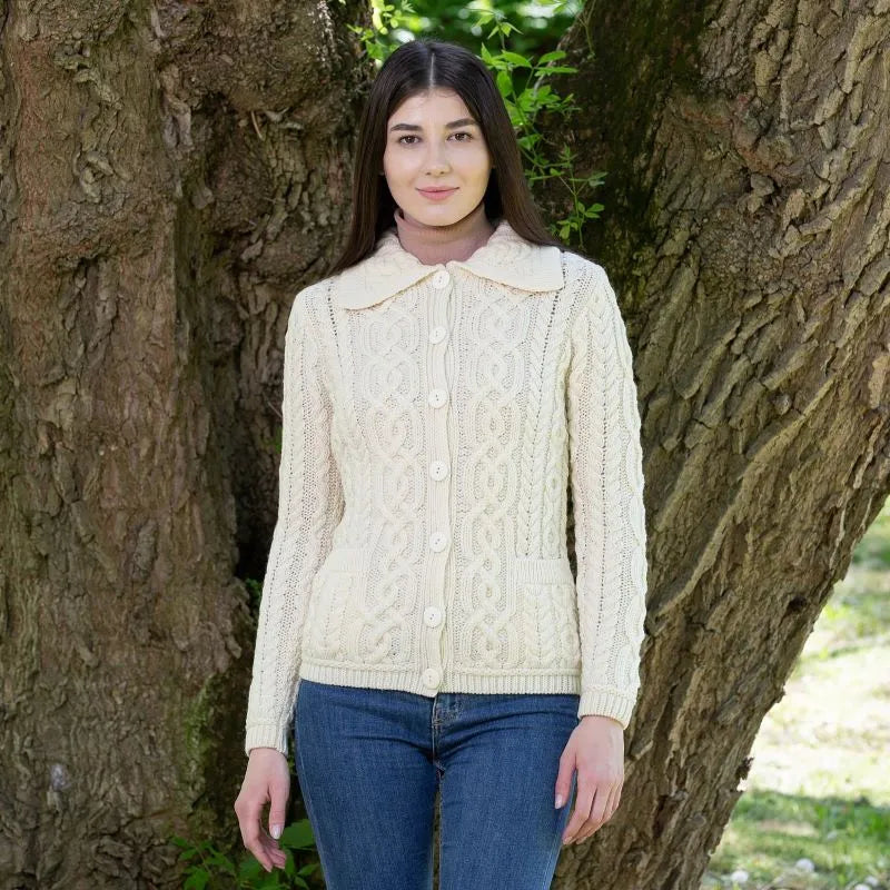 Looking for the perfect Irish piece to add to your wardrobe? This Ladies Aran Cable Knit Button Cardigan is designed in classic Irish style, featuring gorgeous Aran cable stitching. These intricate patterns have deep roots in Irish tradition, symbolizing luck and fisherman's ropes. Every cable stitch tells a story, connecting you to a rich history while keeping you stylishly warm. Made from 100% Merino wool, this Irish cardigan is soft, perfect for staying warm. Merino wool is known for being incredibly comfortable and great at regulating your temperature, so you'll feel comfy in all kinds of weather. It's also naturally breathable, which means you won't overheat even when it's a bit warmer. This Aran knit cardigan is also easy to care for and wash, thanks to the new anti-shrink technology developed by SAOL.With two front pockets, ribbed trim, and button closure, this Aran cardigan is as practical as  stylish. The pockets are handy for keeping your hands warm or stashing small essentials, while the ribbed trim and buttons add elegance and versatility in styling.